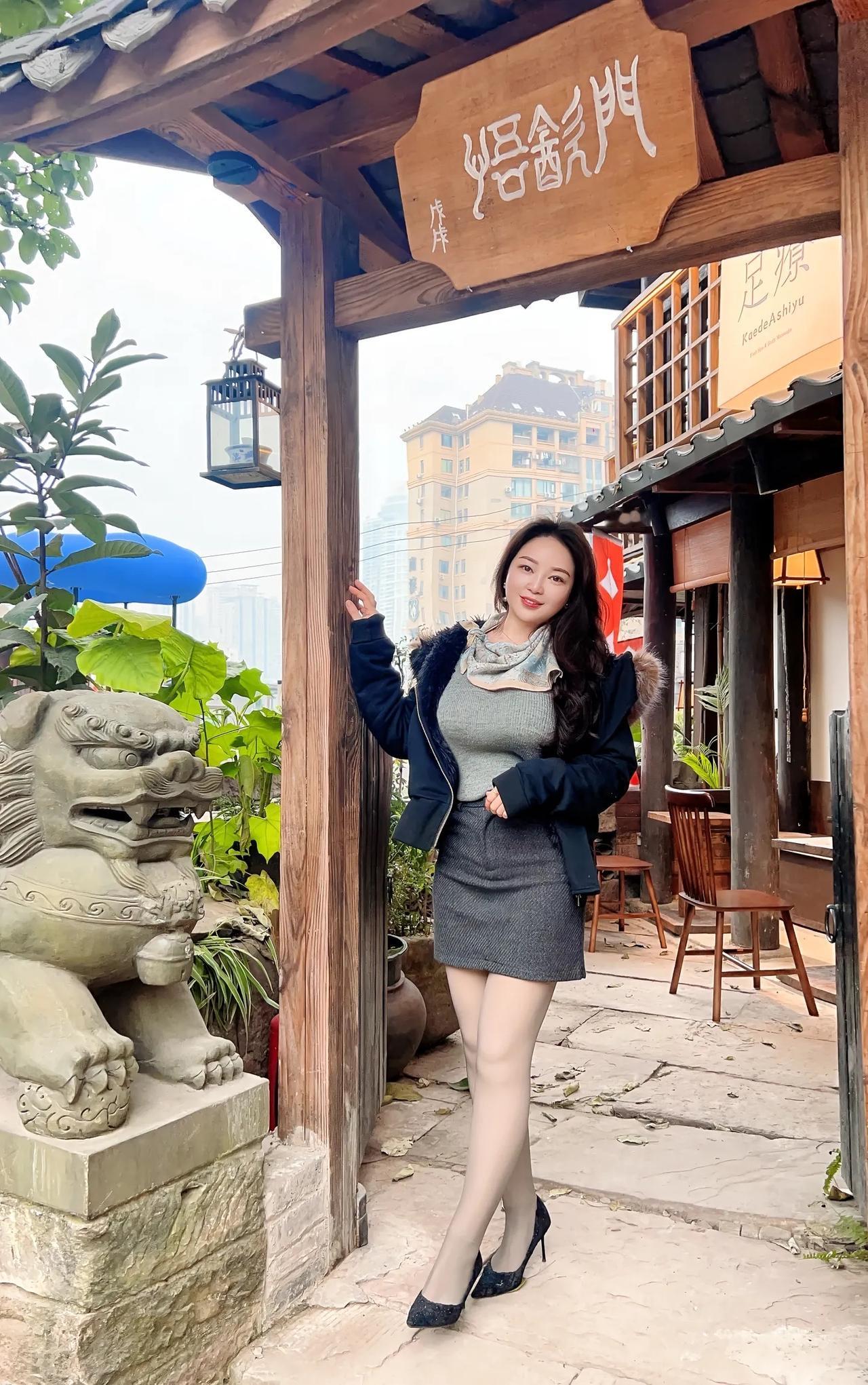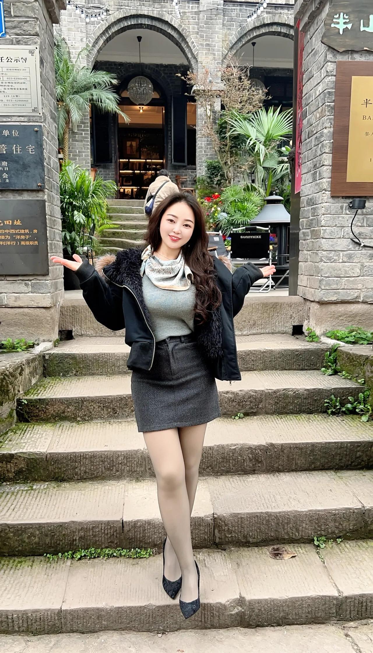 冬日暖阳下,黑裙与长靴的时尚碰撞,尽显都市女性的优雅与自信。