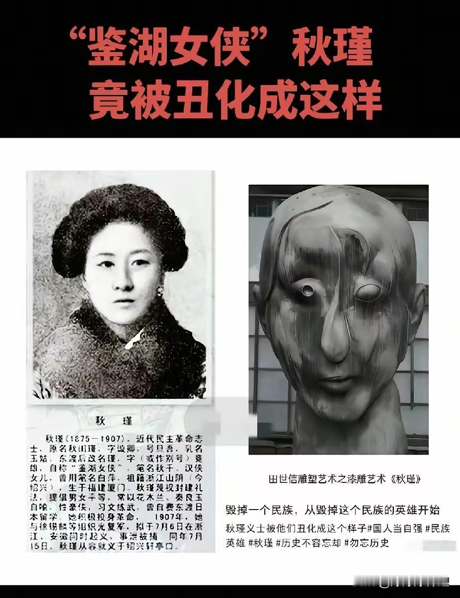 盯着那尊雕塑看了半天,我还是想不通。 这就是田世信大师眼里的秋瑾? 记忆里那个“鉴湖女侠”,那是何等的英姿飒爽,为了革命慷慨赴死时不过才32岁。 可眼前这坨东西,五官扭曲、神情猥琐,说句不好听的,哪怕是捏个地痞流氓也就这样了吧? 我就纳了闷了,现在的艺术家是不是觉得把英雄弄得“人不人鬼不鬼”才叫高级? 别拿什么“艺术夸张”当挡箭牌,老百姓的审美是没那么高深,但我们分得清什么是致敬,什么是恶心人。 这种毫无底线的丑化,根本不是创作自由,就是在挑战大伙儿的忍耐极限。 要是连烈士的形象都能被这么随意践踏,那以后咱们还拿什么去教家里的孩子?