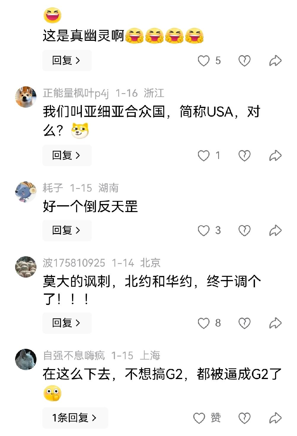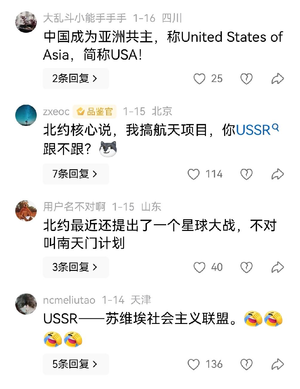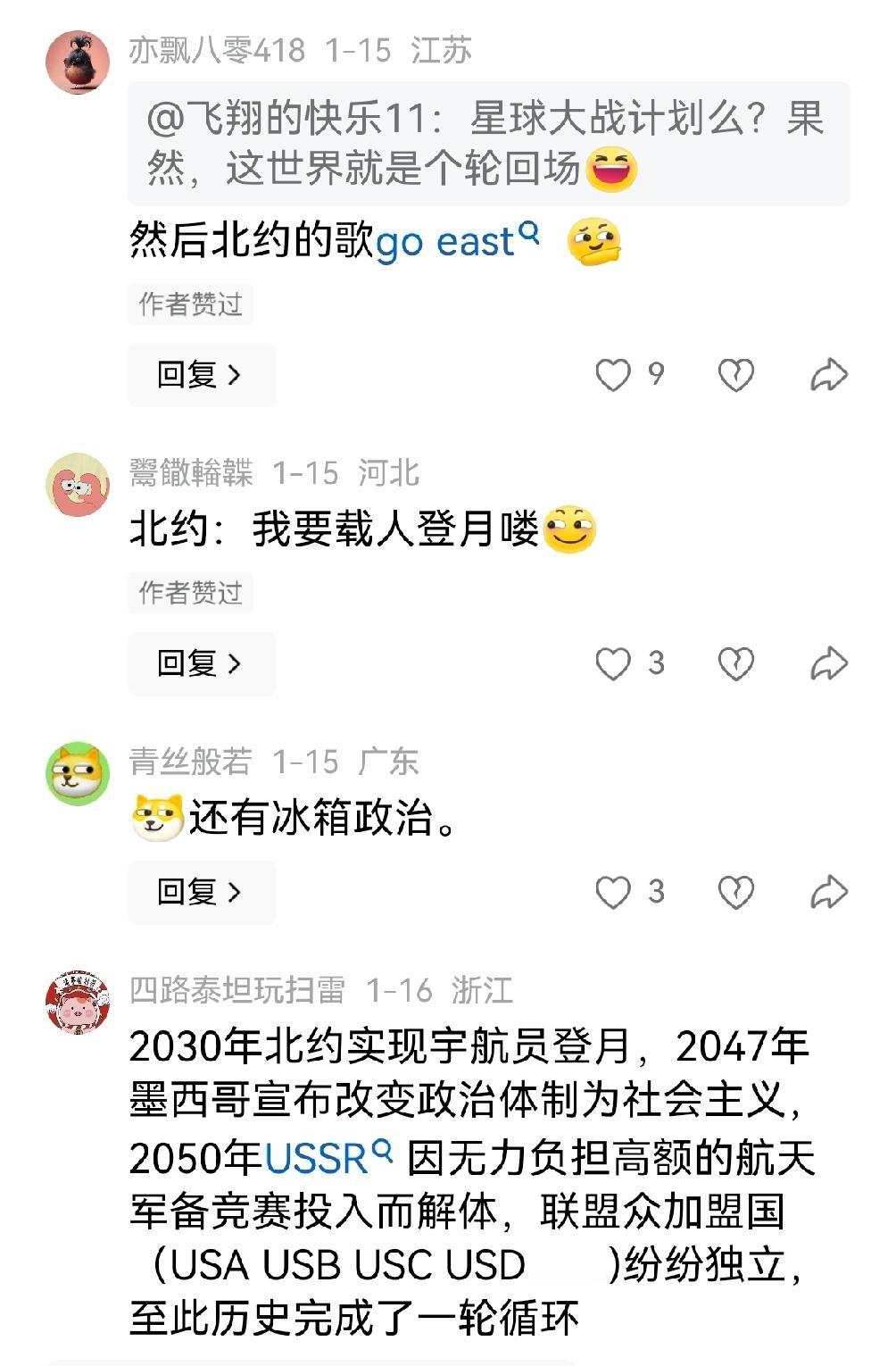 网友太有才了!未来世界将出现两大新阵营:北约、华约??? 一个以北京为核心,强调自由贸易、技术革新,人称“北约”。 一个以华盛顿为核心,对外采取贸易保护,无限抬高贸易壁垒、封闭市场,对内由主导国家人为安排产业链分工,人称“华约”。 此后北约抛出了新的星球大战计划,叫“南天门计划”,问你华约跟还是不跟? 华约并吞加麻大和格陵兰岛,面积直达2200万平方公里,成全球陆地面积最大的国家,全域叫: United States Supervised Realm +,简称:USSR 。 老中成为亚洲共主,全称 United States of Asia,简称:USA。 2030年,USA完成载人登月。 2050年,USSR被南天门计划拖垮,成员国纷纷独立,联盟不复存在,国际地位一落千丈。 自此历史完成又一轮循环,双方都变成了自己最讨厌的样子。 北约