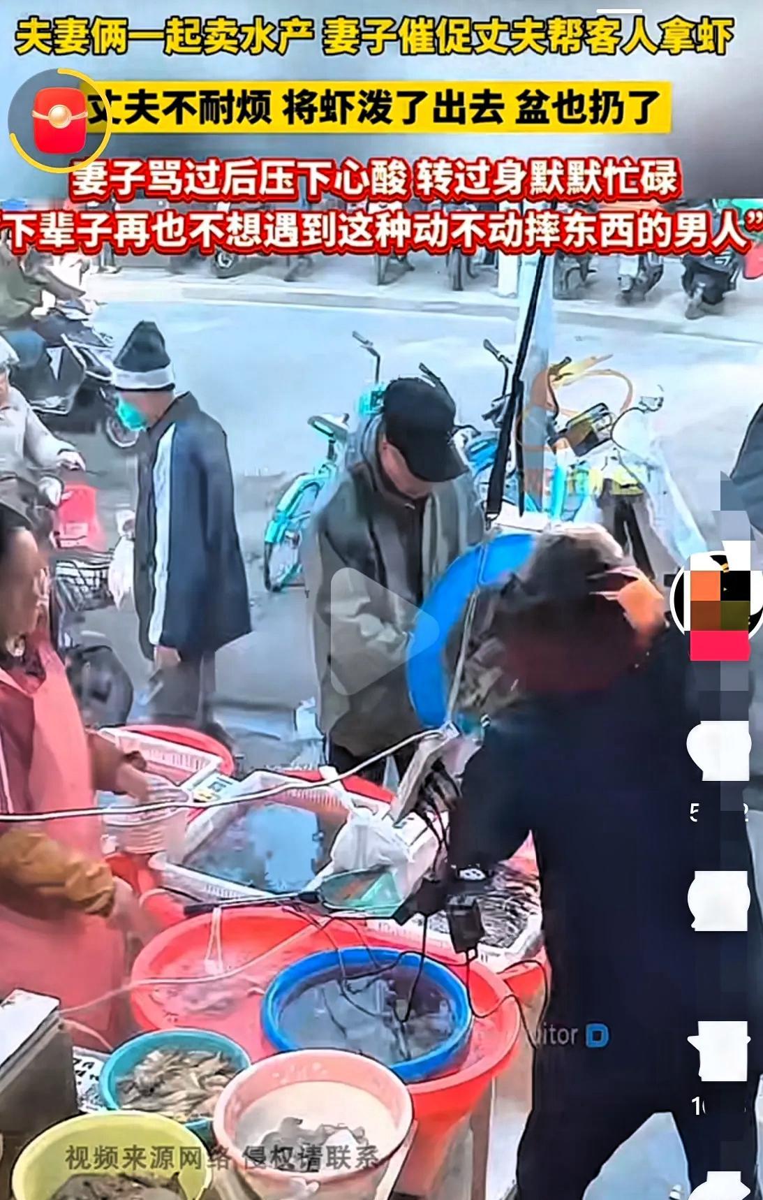 夫妻俩一起卖水产,就因为妻子催着拿虾,丈夫直接把一盆虾连水带盆泼向妻子!虾撒了一