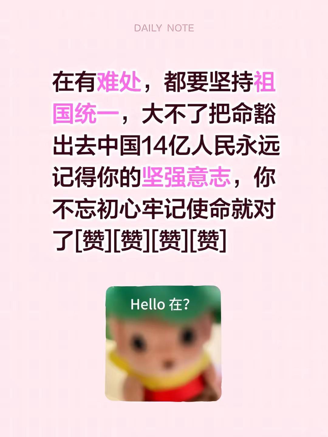 我评论了@小青 的作品:在有难处,都要坚持祖国统一,大不了把命豁出去中国14亿人民永远记得你的坚强意志,你不忘初心牢记使命就对了[赞][赞][赞][赞]