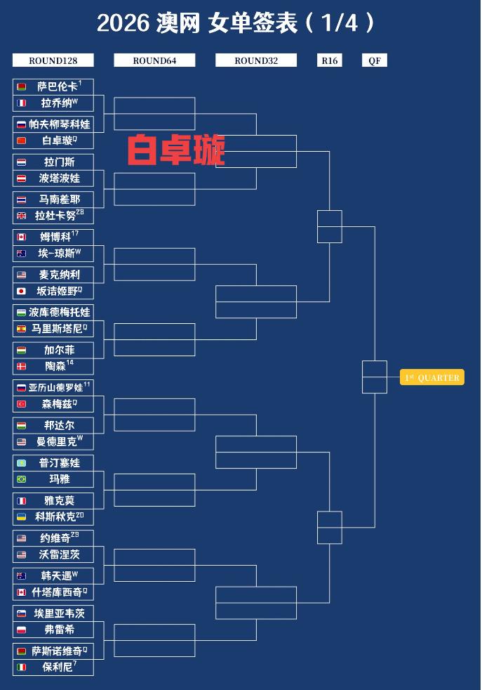白卓璇:如果我有幸过了第一关,那这第二关就能享受在中心球场的待遇了[星星眼] 袁悦:小白呀,我比你厉害,第一关就能享受中心球场的待遇,可我不开心[流泪] 王欣瑜:悦呀,我在深圳时刚战胜丝袜,你也可以的!! 张帅:我们都不差的,姐妹们,加油加油 澳网女单签表 白卓璇 袁悦 王欣瑜