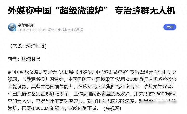 微波武器来了,无人机慌了,战争规则变了 前几天看新闻说中国公布了一个叫“飓风3000”的新设备,它不是导弹也不是激光枪,是靠电磁波来对付无人机的,专家余建军提到,这东西能在三公里范围内让所有靠电力驱动的无人机直接失灵,连那些用光纤控制、不容易被干扰的型号也逃不掉,关键是它不爆炸也不燃烧,只是把无人机内部的电路给烧坏了,成本几乎就是插上电那么点事。 以前人们看待俄乌战场,总以为问题出在武器不够用,实际上并非如此,关键在于成本上划不来。乌军那边地上堆着大量无人机残骸,这些无人机价格便宜,每架不过几千块钱,但拦截它们却要用上价值几十万的导弹,发射一枚就亏掉一笔钱。更麻烦的是,现在无人机还采用了蜂群战术,几百架一起出动,防空系统根本来不及锁定目标,别说防空导弹应付不了,连雷达都反应不过来。这已经不是什么技术难题,而是一道数学题——你无法有效拦截,因为对方数量太多,成本也太高。 “飓风3000”这个系统厉害就厉害在,它不用像以前那样去追着无人机打,也不用非得击中机身才管用,只要在它的作用范围里,微波一扫就能把无人机里的芯片直接烧坏,既不需要仔细瞄准,也不靠计算弹道,反应速度比导弹快得多。美军那边其实也有类似项目,比如雷神公司的CHIMERA,不过还在试验阶段,没真正投入使用。我们这边已经公布了参数,等于告诉全世界:这技术我们已经能实际运用了。 而且这种设备很灵活,功率可以调节,范围也能控制,不会误伤到己方人员,它可以装在车上进行机动部署,也可以装在舰上提供护航能力,将来甚至可能配备在坦克或飞机上,这意味着不只是机场和基地能够使用,前线部队也能随身携带,让防御不再是单纯被动应对,而是主动划定一片“禁飞区”。 现在打仗的方式也在改变,以前主要靠导弹来堆火力,现在讲的是“铁三角”搭配:微波用来大面积瘫痪设备,激光用来精准点杀目标,传统火炮和导弹负责最后打大目标,这样一套下来,单次拦截成本从百万美元降到几块钱电费,关键是能够持续作战,不像导弹打完就得补给,航母、核电站、导弹发射阵地这些关键地方,以后可能会罩上一层“电磁盾牌”。 其实这不是一个单独的事情,中国在能量武器方面已经准备了很长时间,激光有“寂静猎手”系统,电磁炮也在试验当中,现在又加上微波武器,可以说把非动能武器的整个链条都连起来了,这跟美国的做法不一样,美国主要靠买弹药、拼数量来打仗,我们走的是另一条路,用电磁场直接解决问题,乌克兰战场就像是一个全球的实战测试场,谁家的武器好,打一仗就知道了。 2025到2026年,全球至少八个国家都在推进微波反无人机技术,但真正愿意公开实战参数的目前只有中国,这显示出中国不仅具备技术实力,更敢于实际应用和验证,其他国家还在实验室阶段摸索,中国已经将数据摆在台面上,这种差异不只是源于技术积累,更是基于对战场需求的深入理解和快速响应。 说到底,战争就像在玩成本游戏,谁把防守的成本压到最低,谁就能撑得更久,微波武器不是科幻片里的东西,它已经用在现实中,这玩意儿不花哨,但很管用,它不一定一下就把对方打垮,却能让对手根本没有出手的机会,这才是真正的变化——不在于武器更厉害,而是打仗的方式变了。