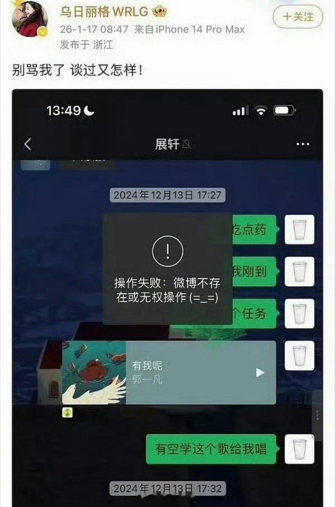 演员乌日丽格晒和展轩的聊天记录,并配文:谈过又怎样!原来麦麸是工作啊没有人不喜欢谈恋爱吧乌日丽格 谈过又怎样