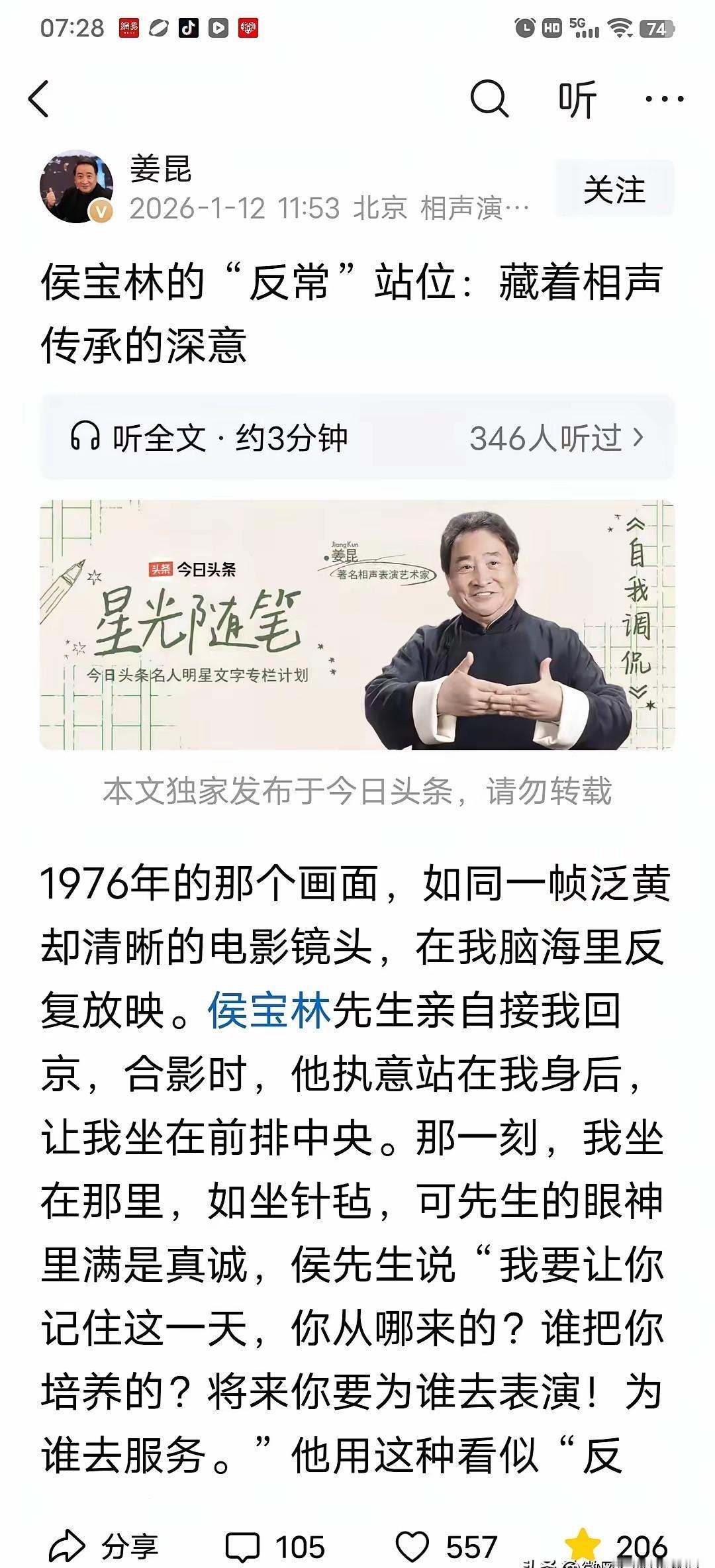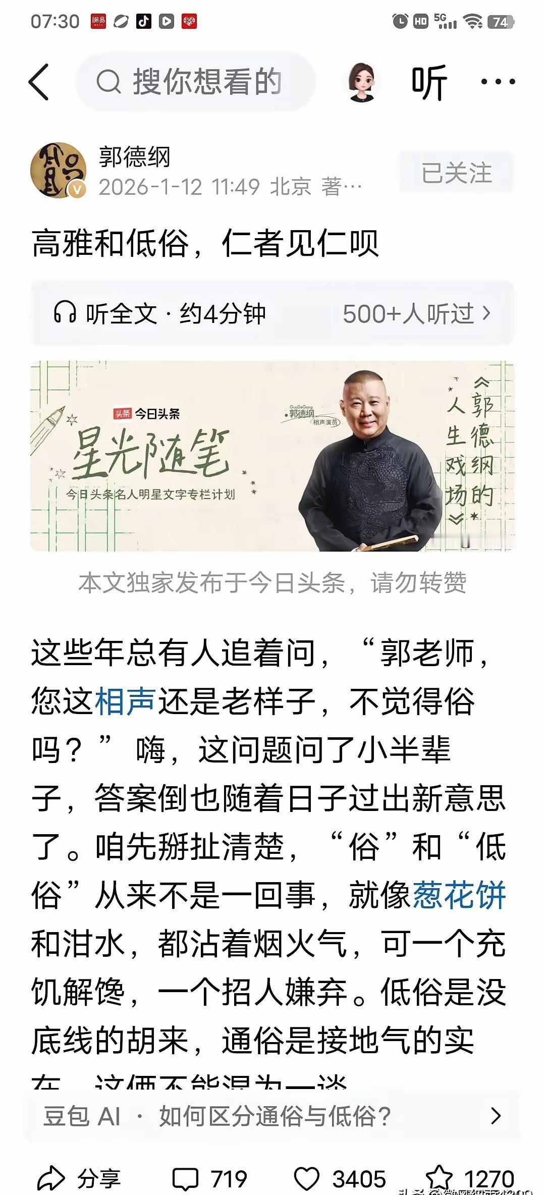 郭德纲和姜昆,几乎同时在头条发文,一个谈“俗”,一个谢师恩。 这巧合,你品,你细品。 这哪是巧合? 分明是相声江湖的两代掌门,在同一个擂台上,亮出了各自的底牌。 一个在解构,一个在传承,时代的声音在此刻交锋。 姜昆在回顾,感谢马季等前辈,强调“为观众服务”。 郭德纲却在解剖,把“俗”和“低俗”掰开揉碎了讲。 一个像博物馆的讲解员,一个像手术台上的主刀医生。 曲协刚开完会,谈“雅俗共赏”,谈“避免低俗”,郭德纲的“俗与低俗”辨析,不就是最生动的现场教学吗? 姜昆的感恩,又何尝不是对“传承”最直白的呼应? 相声这门手艺,到底是该供在神坛,还是该活在市井? 一个在谢幕,一个在开场。 当致敬成为主流,解剖就成了最锋利的刀。 你说,相声的未来,是活在前辈的光环里,还是活在观众的笑声里?