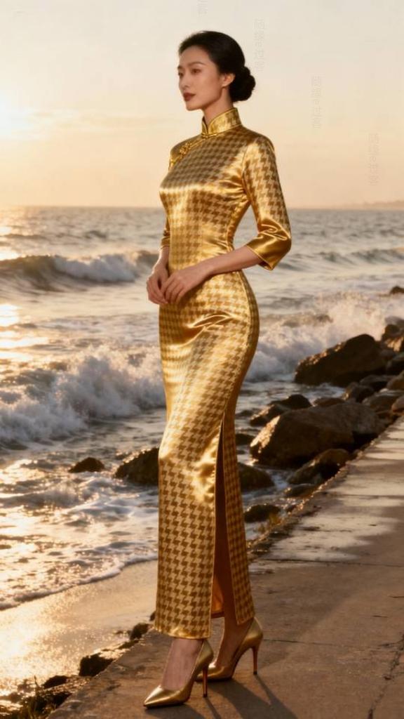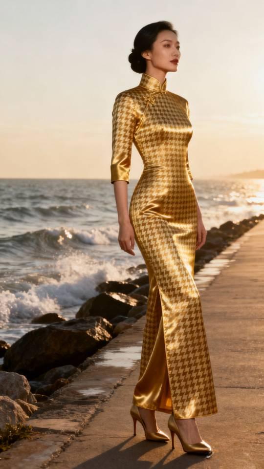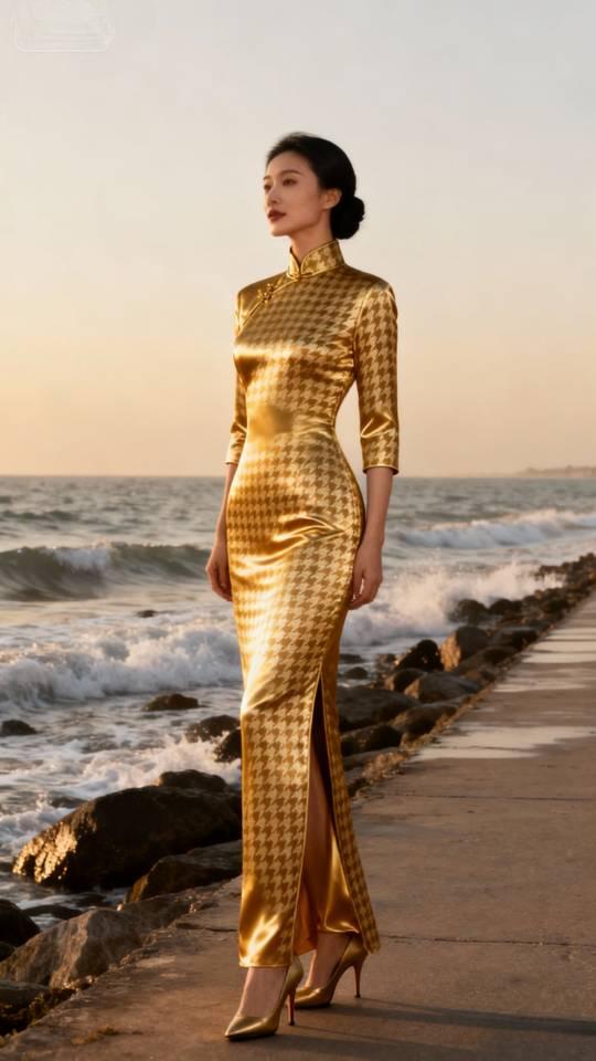 海边漫步,金光闪闪的旗袍,优雅动人!黄金旗袍美人 旗袍美女