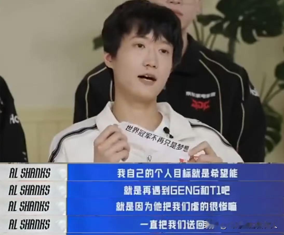 AL中单Shanks在2026年1月17日LPL开赛特别节目《开麦了LPL》中明确表示,个人目标是再遇GEN和T1并完成复仇,称这两支队伍此前多次在国际赛事中击败AL,把他们“送回家”,自己想“把他们也送回家一次”。 2025MSI,AL 2-3憾负T1,无缘决赛。 - 2025EWC,AL 2-3不敌GEN,再次止步关键战。 - S15全球总决赛,AL 2-3遭T1淘汰,止步5-8名。 - 此前Shanks在采访中就提及,AL全队都希望在BO5中击败LCK战队,完成复仇、证明自己。 - Shanks是AL的核心中单,2025赛季带领队伍多次在国际赛事展现竞争力,与LCK顶尖战队交手均打满BO5,虽未取胜但差距逐步缩小。 - 2026赛季,AL保留核心阵容,Shanks的复仇宣言体现了队伍冲击更好成绩的决心,也成为LPL赛区对抗LCK的一大看点。 未来Al发展 Theshy