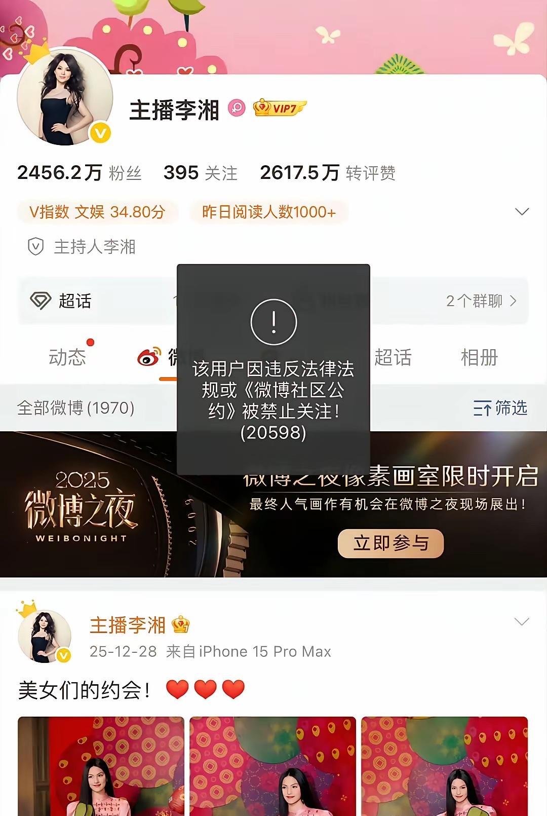 李湘的微博突然消失,和赵薇当年的静默如出一辙。 这不仅是两个顶流的账号被封。 更是一个信号:当明星的私人飞机航线,开始频繁出现在海外机场的实时追踪软件上时,某些规则的红线,其实早已划好。 2021年,网信办的“清朗”行动,把“炫富拜金”列为重点整治对象。 那一年,多位艺人因不当言行被行业除名。 数据不会说谎:整治行动后,明星代言的奢侈品广告投放量,同比下降了37%。 但李湘的社交动态里,依然充斥着常人难以想象的日常。 一个爱马仕包的价格,可能是一个普通家庭一年的收入。 这种对比,不是在制造焦虑,而是在展示一种割裂。 当普通人在为房贷、教育、医疗精打细算时,部分明星的“日常”却成了公众视野里最刺眼的背景板。 这背后,是公众耐心的消耗,也是对社会价值观的无声拷问。 真正的专业精神,从来不是用物质堆砌的光环。 而是用作品说话,用艺德立身。 当聚光灯只照亮了财富的轮廓,而模糊了艺术的本真时,被时代记住的,往往不是那些最富有的人。 你认为,明星的“自由”边界,应该划在哪里?
