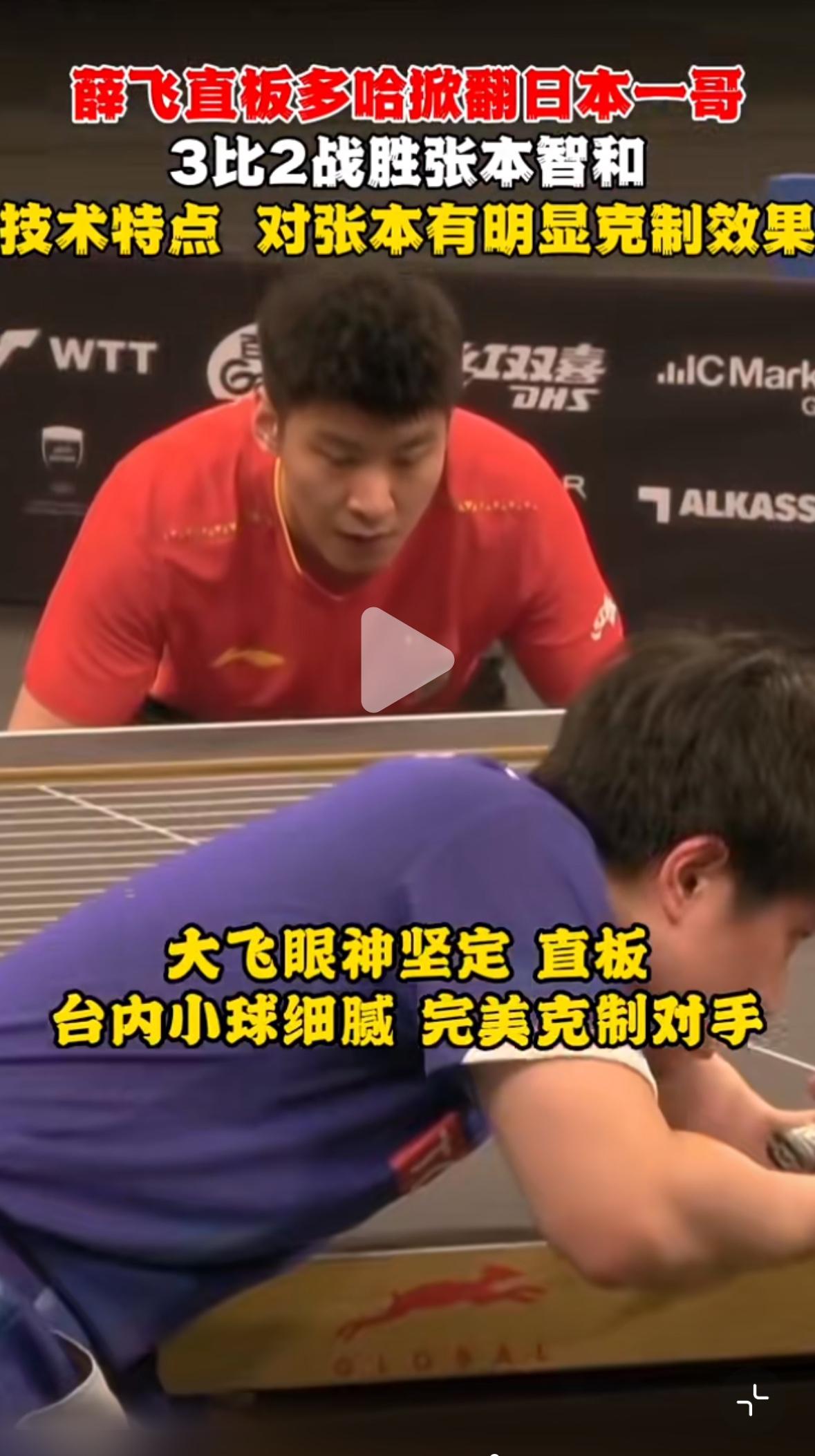 薛飞直板多哈再次掀翻日乒一哥张本智和——薛飞是张本的克星实锤 日乒男队就此全军覆没! 1月17日,多哈球星挑战赛男单1/8决赛, 薛飞3:2张本智和, 连续三次打败张本, 薛飞的技术明显克制张本, 把张本打的没有脾气! 薛飞是张本的克星,实锤啦! 乒乓球圈子和网球圈子一样, 克星闭环! 日乒男队在单打项目上就此 没有人啦! 张本又输了, 就是过瘾, 佩服薛飞,因为直板选手小勒布伦 连续两次输张本, 这一次比赛真替薛飞捏一把汗, 还好赢了, 恭喜薛飞对张本智和保持三连胜……