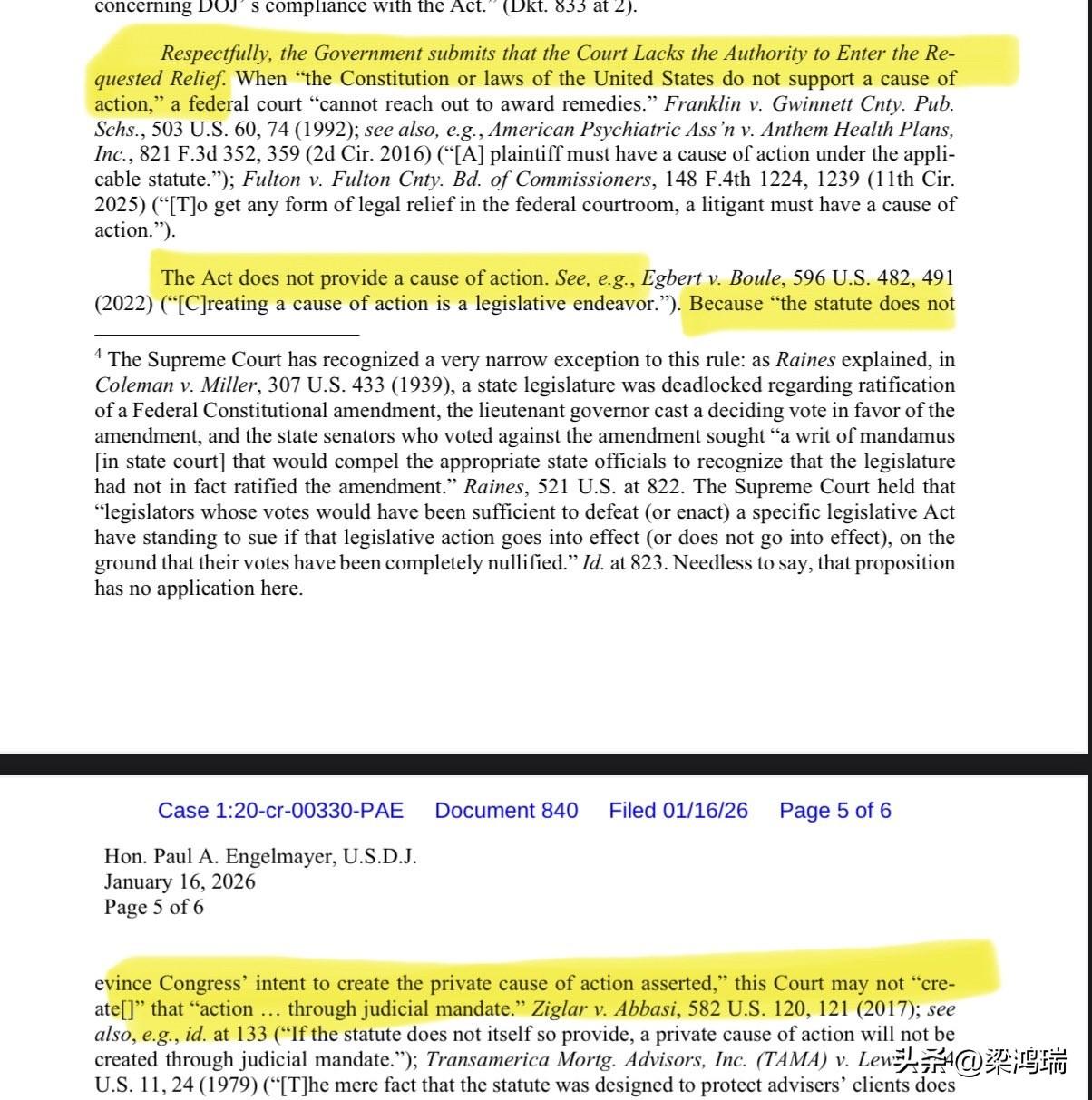 最新消息:美国司法部已提交动议,阻止任命独立监督员公布吉斯莱恩·麦克斯韦案中的爱泼斯坦档案。 美国司法部辩称,联邦法院无权执行《爱泼斯坦透明法案》,众议员罗·卡纳和托马斯·马西也没有资格推荐独立监督员。 简而言之,司法部的立场似乎是,任何法院都不能强迫他们提供这些文件。