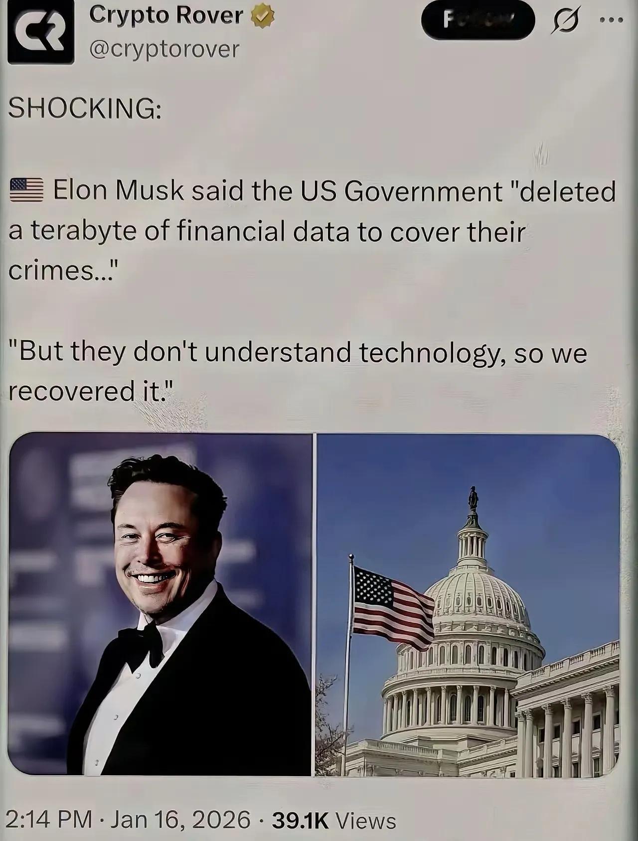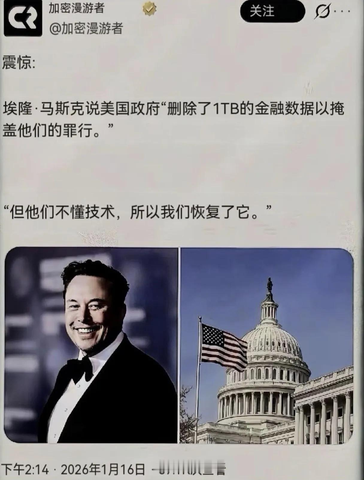 马斯克又出来炫技了!声称美国政府删除了1TB的金融数据,试图掩盖他们的罪行。他也没有说明这是哪方面的金融数据,难道是操纵金融市场的数据?如果真的是,那事儿可真不小! 马斯克接着又说他已经把数据恢复了,不知道这是在向谁喊话,难道他想用这些数据拿捏别人吗?还是太年轻了,商人插手政治下场一般都不会太好。