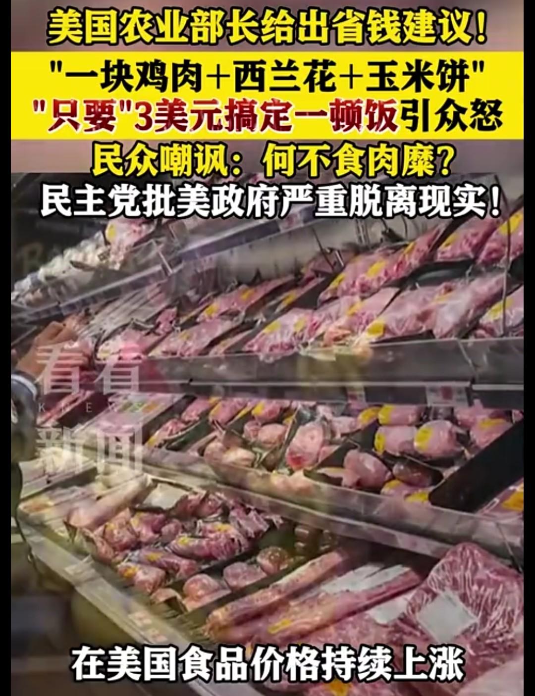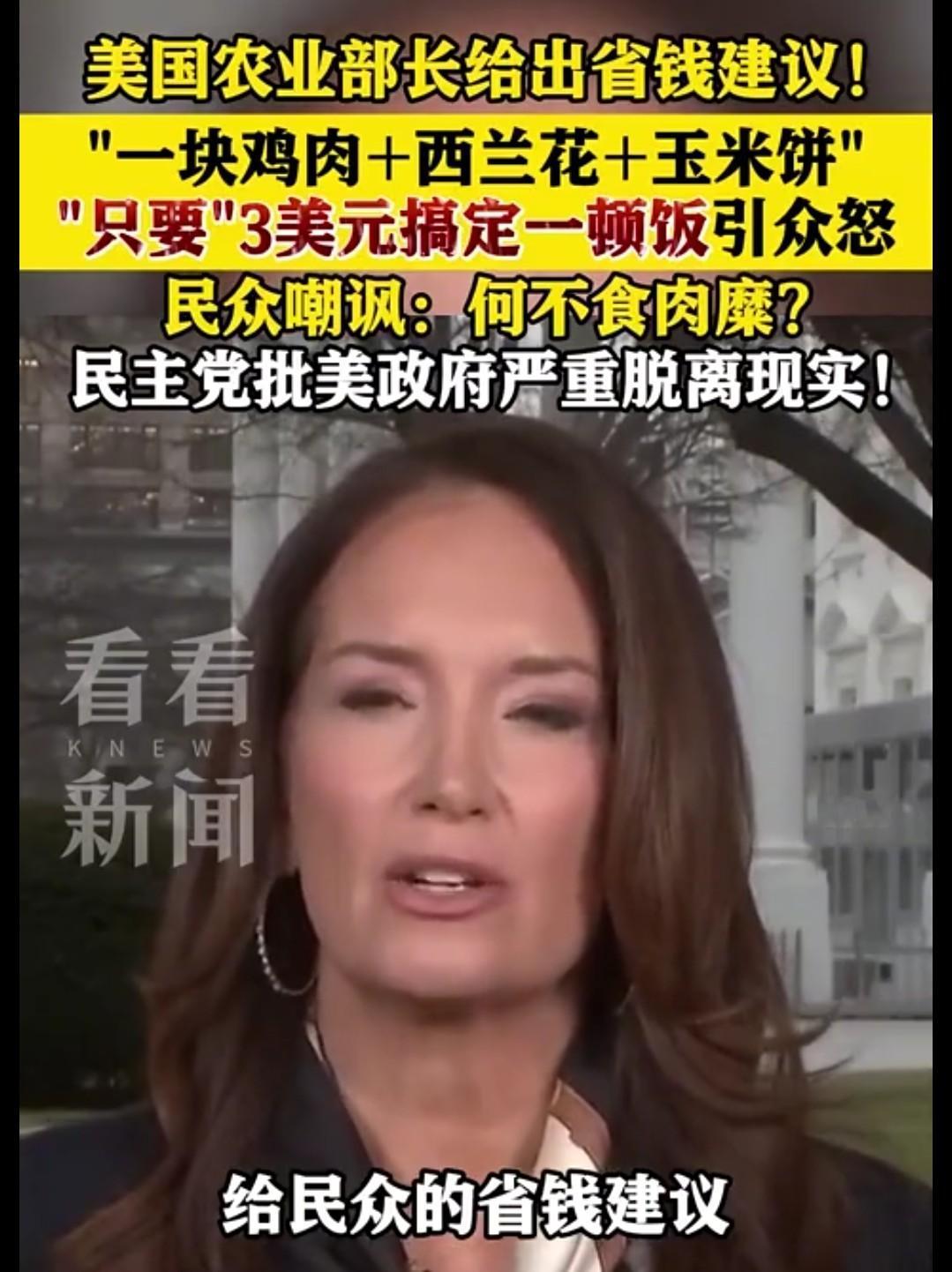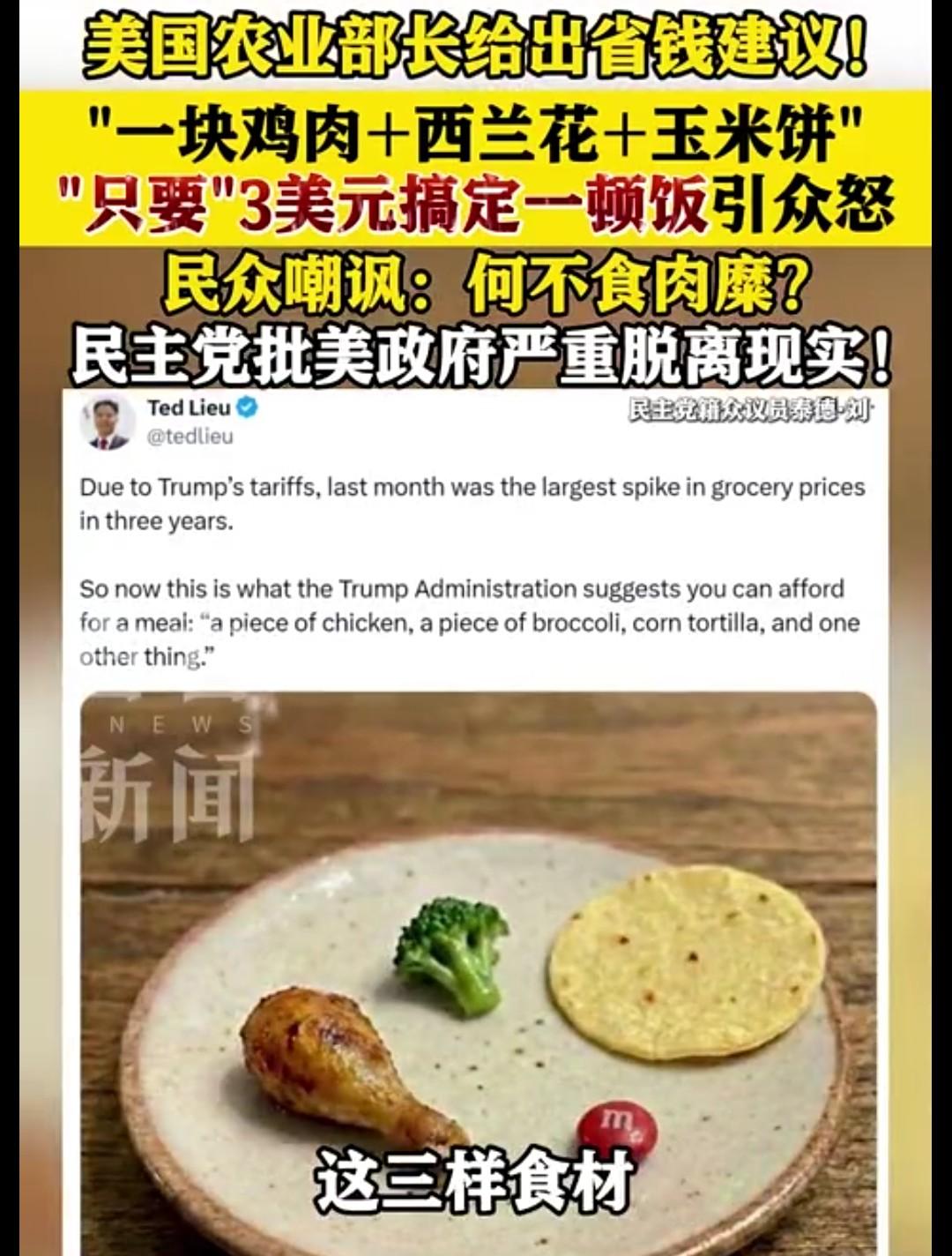 一块鸡肉、一块西兰花、一块玉米饼再加上一点其他的东西,只要三美元就能填饱肚子? 这是美国农业部长给出的建议,说这样吃既省钱还健康。 有人批评她的这些说法完全脱离现实,是现代版的何不食肉糜。 有人指出,三美元买不来这些,而且这些东西还需要自己加工做熟,这又是另外的成本。 我想问的是,这几样东西真的能吃饱吗?我虽然是个女的,不过饭量有点大,这几样东西,我觉得我没法吃饱。