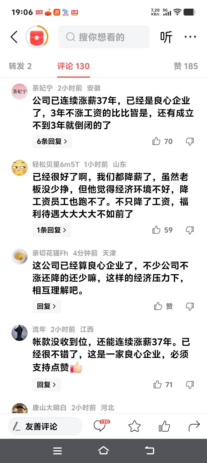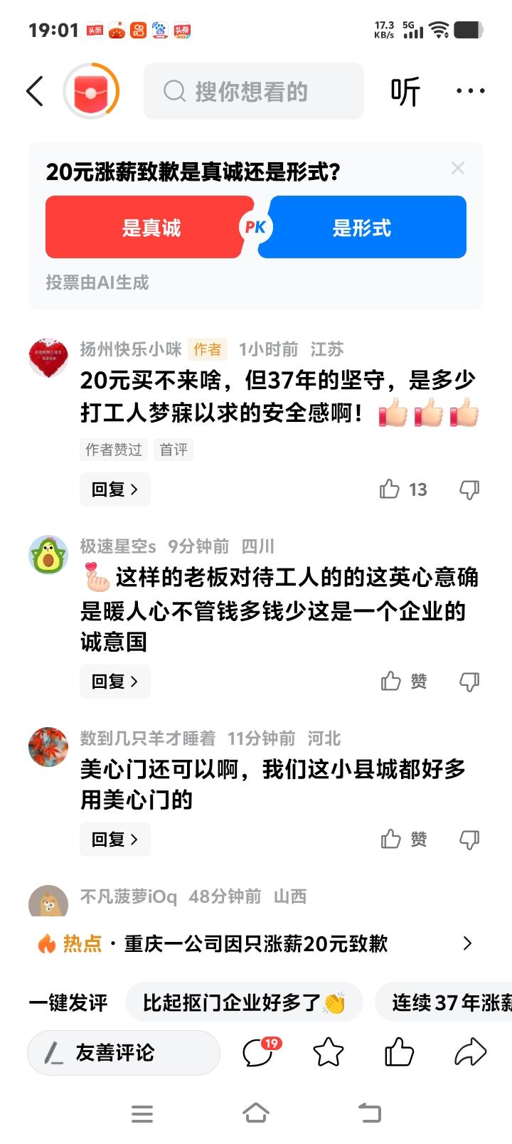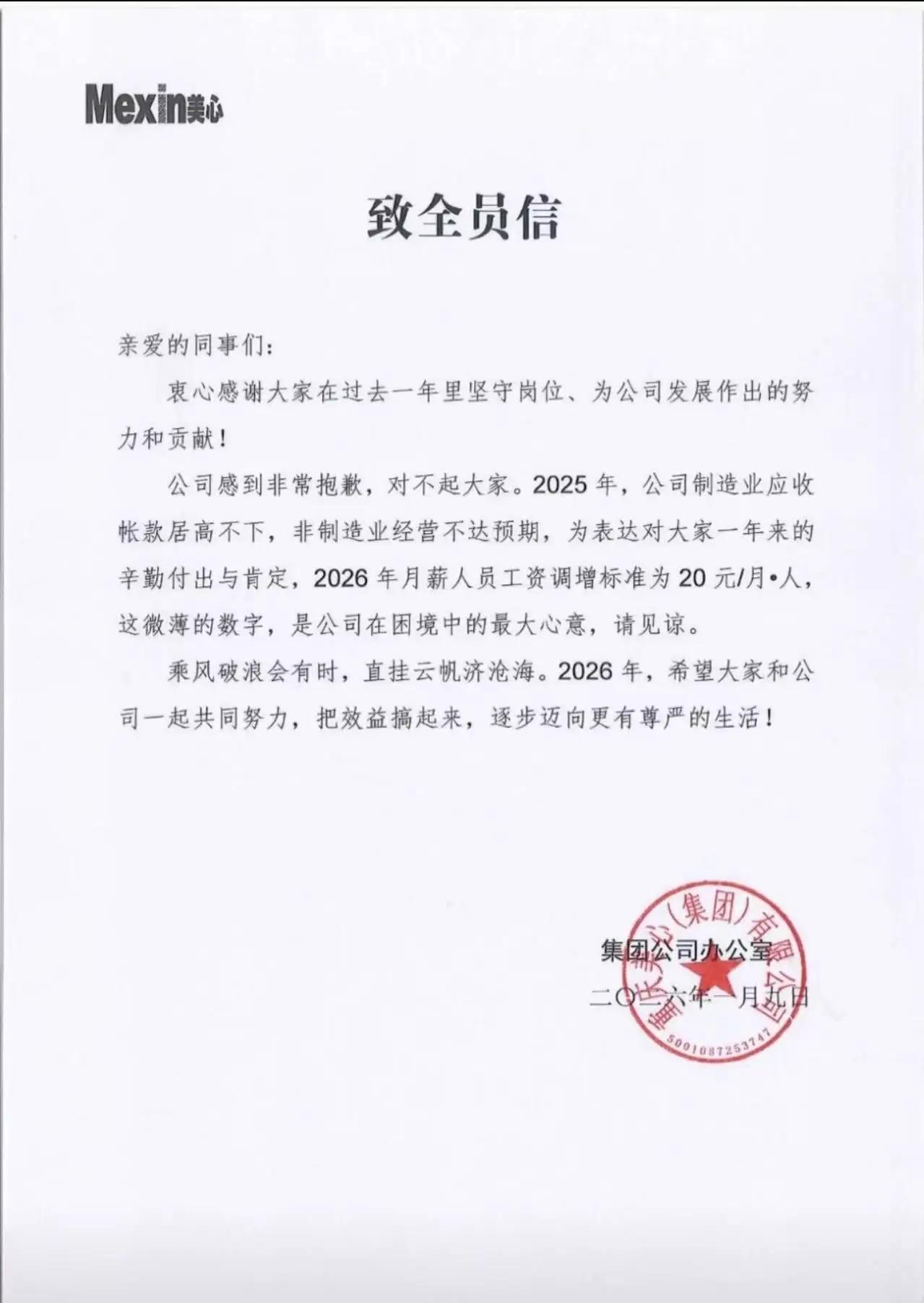 重庆美心集团37年涨薪20元致歉信刷屏:打工人吵翻,这杯奶茶钱背后藏着中国职场最稀缺的真诚! (来源:综合自潇湘晨报、黄河新闻网及网络热议) 当重庆美心集团的致歉信在员工手机里弹出时,许多人揉了揉眼睛——不是裁员通知,不是降薪公告,而是一封为“每月仅涨薪20元”而写的道歉信。信中那句“这微薄的数字,是公司在困境中的最大心意”,像一颗石子投入沉寂的湖面,涟漪从山城重庆荡向了全网。有人冷笑:“20元够买什么?连杯像样的奶茶都勉强!”有人哽咽:“37年从未间断涨薪,这份笨拙的坚持比黄金更珍贵。” 这封致歉信背后,是一家民营企业的“固执”。从1989年创办至今,美心集团连续37年坚持为员工涨薪,哪怕在行业寒冬的2023年只涨了50元,哪怕2026年经营压力下只能挤出20元,这条规矩从未打破。公司负责人坦言:“应收账款居高不下,非制造业板块未达预期,每人20元已是咬牙之举。”但正是这“咬牙之举”,让上万名员工在不确定的时代里,触摸到了一种近乎古董的确定性。 车间老师傅老李的工资条,像一部企业简史。他指着每年微调的数字说:“1998年亚洲金融危机涨了30元,2008年全球金融危机涨了80元,疫情三年也没断过。钱不多,但公司从没偷偷取消过这条规矩。”在裁员潮席卷制造业的今天,这种“雷打不动”的承诺,成了流水线上最硬的底气。年轻人或许嫌弃20元不够一顿外卖,但老员工知道,这份坚持背后是“共渡难关”的契约精神。 网友的争论撕裂了职场价值观。一方晒出截图:“我们公司三年没涨薪,老板却换了辆保时捷。”另一方反讽:“道歉能当饭吃?不如实实在在多发点钱。”但更多声音在算另一笔账:一家企业愿意为20元涨薪道歉,意味着它仍把员工当“自己人”。比起那些效益暴涨却哭穷降薪的企业,美心的“透明式窘迫”反而戳中了人心最柔软处——职场需要的不仅是钱,还有被尊重的温度。 这20元像一面镜子,照见了中国职场的两种现实。一边是部分企业将人力视为成本,效益下滑时首先挥向员工;另一边是美心这样的企业,将员工视为伙伴,哪怕自己淋雨也要为对方撑一把小伞。这种“小伞哲学”在功利主义的商业逻辑里显得格格不入,却恰恰解释了为何美心员工流失率远低于行业均值——安全感,才是当代打工人最渴求的奢侈品。 从管理学角度看,美心的“致歉式涨薪”实则是一场高明的信任投资。当企业坦诚困境,员工反而更容易形成共同体意识。一位员工留言:“公司上次道歉是涨50元,后来效益好转补了奖金。它不画饼,我们就敢信。”这种累积37年的信用,远比短期高薪更难复制。或许正因如此,当“美心门”成为热搜词时,许多人默默记下了这个品牌——良心对待员工的企业,产品大概率不会差。 然而,理解不代表满足。年轻员工小陈的吐槽很现实:“20元在重庆只够加两次公交,房租却年涨10%。我们需要诚意,更需要生存。”这揭示了涨薪争议的核心:企业诚意与生活成本的赛跑。当“微小涨薪”遇上“巨大压力”,理解与无奈交织成打工人的复杂表情。但换个角度想,如果连这20元诚意都成稀缺品,职场生态究竟缺失了什么? 这场讨论早已超越“20元值不值”。它成了衡量企业良心的标尺:是选择在顺境时与员工共享果实,还是在逆境时独自缩进壳里?美心用37年回答了一个问题——企业的温度,不在于巅峰时能发多少奖金,而在于低谷时仍愿伸手紧握员工的手。这种“不抛弃”的基因,或许才是穿越经济周期的真正免疫力。 重庆的雾终究会散,企业的冬天也终将过去。但致歉信里那句“最大心意”留下的烙印,或许比任何薪酬数字都持久。它提醒所有企业:员工的心不是靠KPI计算的,而是用一次次“不辜负”攒出来的。当职场充斥画饼与套路时,笨拙的真诚反而成了最锋利的武器。 所以,当你下次抱怨公司抠门时,不妨想想这20元的故事——它或许买不起梦想,但能买来一份“有人与你共风雨”的踏实。而这,恰恰是无数打工人深夜加班时,最想握住的微光。 职场温度 良心企业