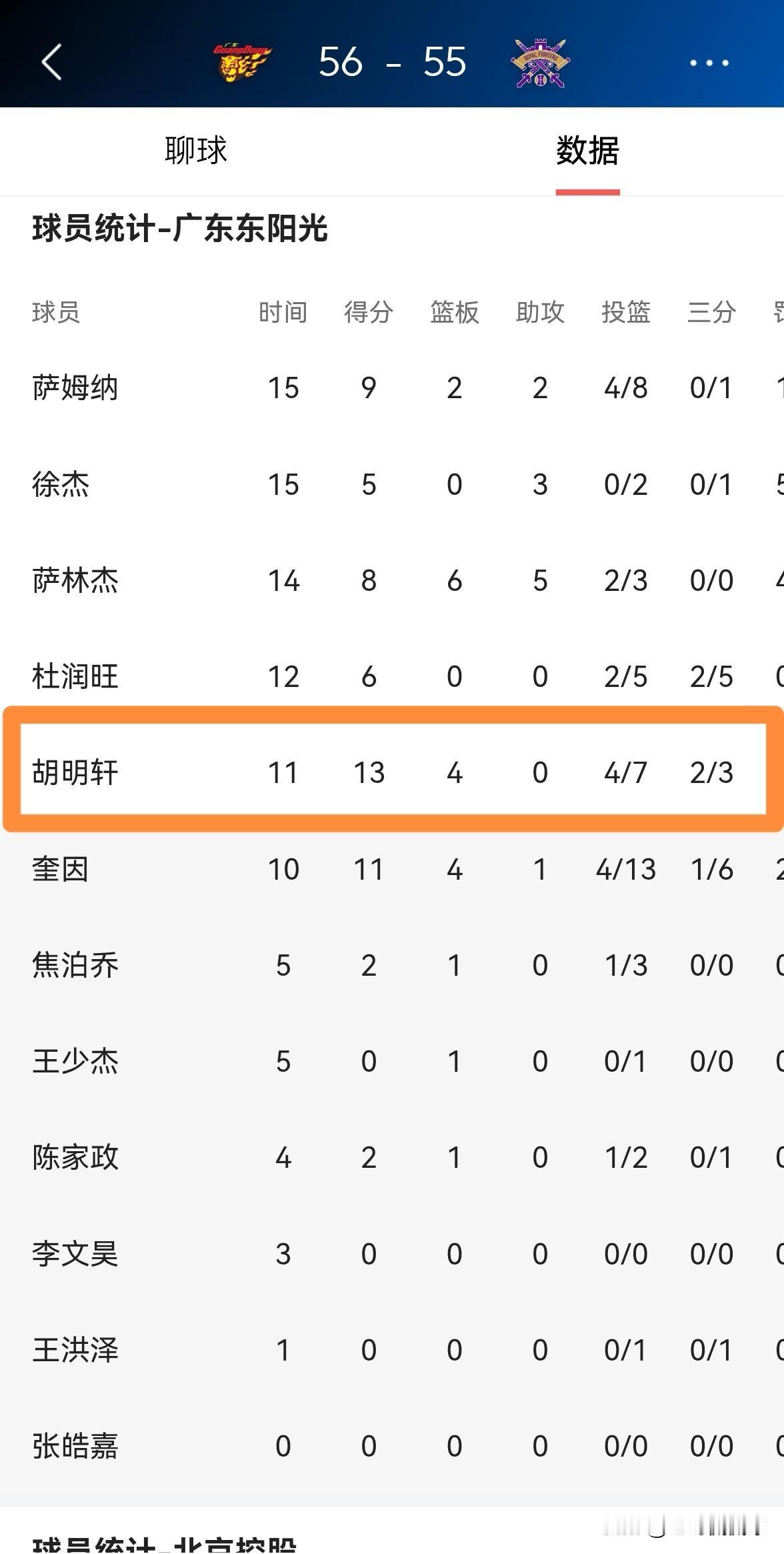 广东东阳光超级球星胡明轩真是彻底的爆发了!在今天广东东阳光主场迎战北京控股的比赛中,目前双方半场战罢,广东东阳光以56:55领先对手。值得一提的是,在前两节比赛中,之前一直萎靡不振的胡明轩迎来了大爆发,他在首发出战的11分钟里,投篮7中4,其中三分球3中2、罚球3中3非常高效的砍下13分,还有4篮板,没有出现任何的失误,他的场上正负值为+9。 老实说,今天的胡明轩真是充满了血性,他在开场以后就展现出了超强的进攻欲望,整个人看起来杀气腾腾。