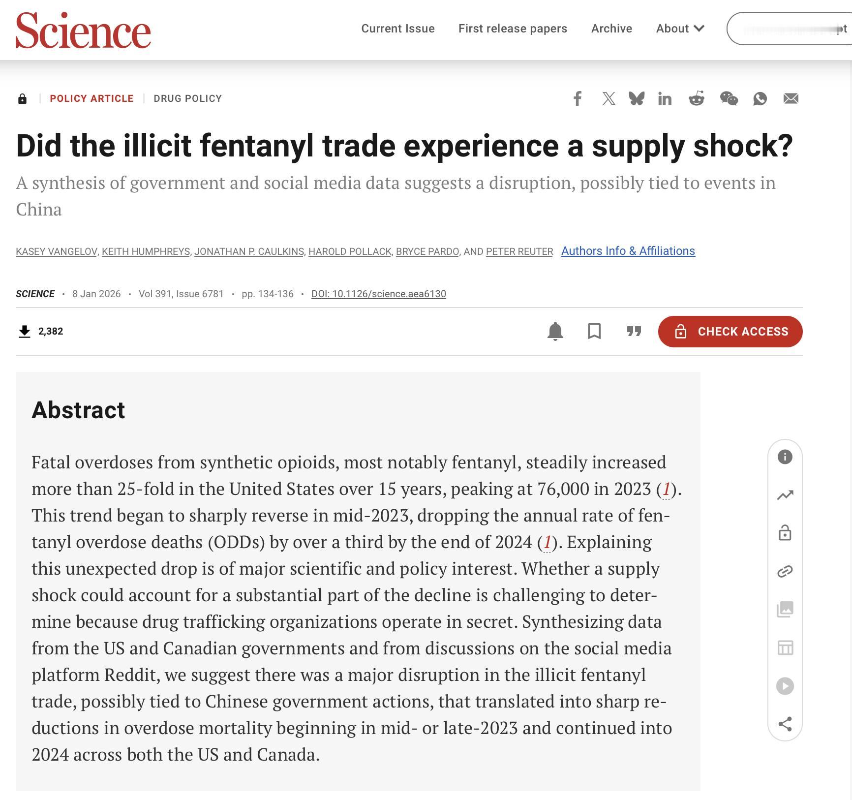 2026 年 1 月 8 日发表于 Science 的研究指出,美国药物过量死亡数的明显回落,与全球芬太尼供应链遭到收缩高度相关,而这个转折点很可能,来自中国对化学原料供应商的加强管制。《Science》反正就认为跟川普无关