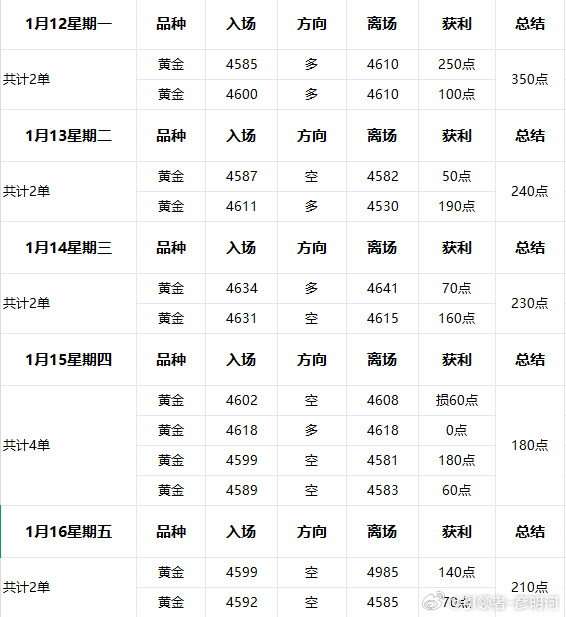 1月12-1月16周复盘;本周在操作上依旧是顶中顶,同时也是帮助加入的朋友成功翻仓!行情如此美好,单子如此美妙!不愧于我的签名,交易中的艺术家!共计布局12单,拿下1210点收获!一个人若是想成功,要么自己绝对优秀专业,要么和优秀负责的人合作。在这个瞬息万变的市场里,单打独斗者,路就越走越窄,选择志同道合的伙伴,就是选择了成功!黄金金价