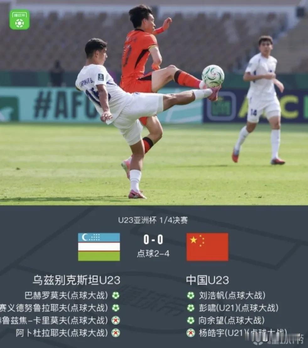 4-2,国足U23在点球大战中淘汰乌兹别克斯坦,晋级U-23亚洲杯四强。 李昊封神一战,120分钟内没让乌兹别克斯坦攻破自己把守的大门。四场比赛,国足零失球,在防守端做得不错,特别是门将李昊。 国足半决赛对手将是澳大利亚对阵韩国的胜者,小组赛国足1-0击败过澳大利亚,也是这场胜利奠定了球队小组出线的基础。韩国队在小组赛的表现并不是那么好,国足有能力一战。 加油!国足!