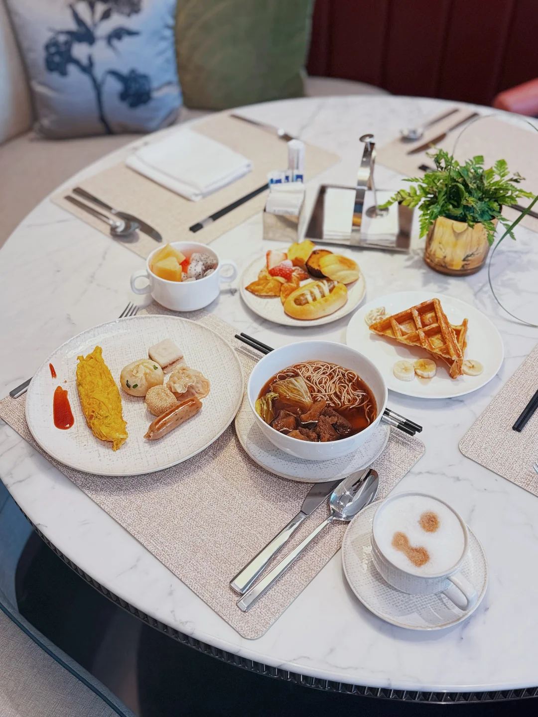 早餐同样不敷衍。上海牛肉面、生煎包、枫泾鲜肉烧麦,吃得有在用心准备。不是那种走一圈却不知道该拿什么的早餐厅,也让酒店多了一份烟火气。