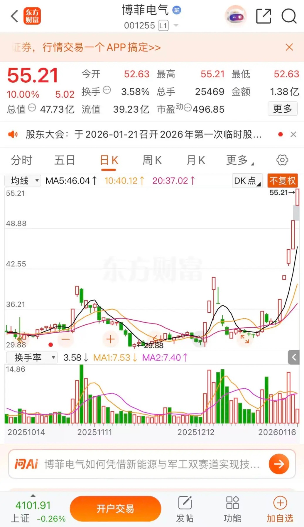 博菲电气未来百元股,长电科技二板涨停,科技股还是主角博菲电气涨停收盘报收55.21元每股,成交金额1.38亿,5连板,3浪了,7连板有机会。长电科技涨停收盘报收48.39元每股,成交金额92.87亿,总市值865.9亿,千亿市值不是梦。近期高点53.43元每股突破就在下周二科技股还是主弦力,把握节奏,今年势必有望5000点。