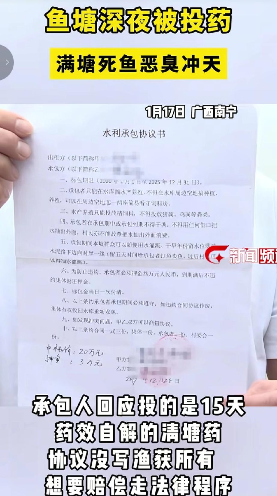 2026年1月17日,广西南宁坛洛镇东佳村定坡的一个鱼塘深夜被投药,满塘死鱼,恶臭冲天。事情的起因是鱼塘承包人因承包协议到期,到期后村民认为协议到期后鱼塘塘里的渔获归集体所有,要求承包人赔偿并治理被污染的塘水。承包人则回应称投的是15天药效自解的清塘药,且协议没写渔获归属,若要赔偿建议走法律程序。目前警方已采样,坛洛镇司法所将组织协商。(来源于@广西新闻频道 )