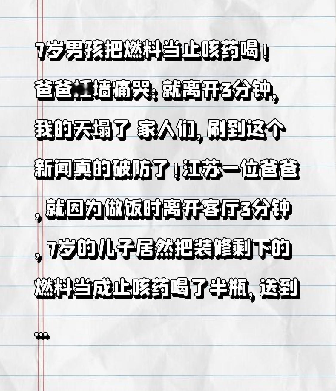 7岁男孩把燃料当止咳药喝!爸爸捶墙痛哭:就离开3分钟,我的天塌了 家人们,刷到这个新闻真的破防了!江苏一位爸爸,就因为做饭时离开客厅3分钟,7岁的儿子居然把装修剩下的燃料当成止咳药喝了半瓶,送到医院时嘴唇发紫、呕吐不止,医生下了病危通知书,爸爸在抢救室外捶墙痛哭:“是我没看好孩子啊!” 事情发生在江苏盐城的一个普通家庭。当天孩子有点咳嗽,妈妈给冲了止咳糖浆放在茶几上,就去厨房帮忙做饭。爸爸想着去阳台拿个东西,前后不过3分钟,回来就看到孩子拿着一个矿泉水瓶,嘴角还沾着褐色液体,说“这个药有点辣”。 爸爸瞬间头皮发麻!他认出那个瓶子里装的是装修时剩下的木器漆稀释剂,属于易燃化学品,含有苯、甲醛等剧毒物质。他赶紧抱起孩子用清水漱口,可孩子已经开始呕吐、喊肚子疼,嘴唇和指甲慢慢变成青紫色。夫妻俩疯了一样抱着孩子往医院跑,路上孩子意识越来越模糊,到急诊时已经陷入半昏迷状态。 医生一看就知道情况危急,立刻启动紧急抢救:洗胃、导泻、注射解毒剂,同时联系重症监护室准备。CT检查显示,孩子的食道、胃黏膜已经严重灼伤,肝脏和肾脏也出现损伤,随时可能引发多器官衰竭。抢救室外,爸爸蹲在地上不停地扇自己耳光,妈妈哭得瘫倒在地,嘴里反复念叨“都怪我们,都怪我们没把东西放好”。 就在所有人都揪着心时,转折点出现了!经过48小时的全力抢救,孩子的生命体征终于趋于稳定,从重症监护室转到了普通病房。医生说,幸好送医及时,而且家长第一时间做了清水漱口的应急处理,没有让毒素进一步扩散,否则后果不堪设想。但孩子后续还需要经历多次食道修复手术,漫长的康复期想想都让人心疼。 其实类似的悲剧真的太多了!去年山东一个2岁宝宝,把奶奶的降压药当成糖果吃了10多片,抢救无效离世;安徽一名3岁男孩,误喝了爷爷放在饮料瓶里的农药,虽然保住了命,却留下了终身后遗症。这些案例都在提醒我们:家长的一时疏忽,可能会给孩子带来一辈子的伤害! 医生特意强调了几个关键知识点,家里有孩子的一定要记牢:第一,危险物品绝对不能用食品、饮料瓶存放,必须保持原包装,贴上明显标签;第二,要放在孩子够不到的高处,最好加锁存放;第三,发现孩子误服有毒物品,先让孩子用清水漱口,保留误服的物品或包装,立刻送医,千万别催吐(腐蚀性物品催吐会二次灼伤);第四,平时要给孩子灌输“不随便吃陌生人给的东西,不喝没见过的饮料”的意识。 每个孩子都是家长的心头肉,可意外往往就发生在一瞬间。看着病床上虚弱的孩子,再看看家长悔恨的泪水,真的让人无比揪心。作为家长,我们总觉得“孩子在身边看着就没事”,可恰恰是这种侥幸心理,可能会酿成无法挽回的悲剧。 家庭安全无小事,尤其是有年幼孩子的家庭,一定要把危险物品收好,多给孩子普及安全知识。希望这个孩子能早日康复,也希望所有家长都能引以为戒,别让一时的疏忽,成为一辈子的遗憾。 你身边有没有遇到过类似的惊险时刻?关于孩子居家安全,你有什么好的建议?欢迎在评论区分享,提醒更多家长重视,关注我,下期带你了解更多儿童安全防护干货!