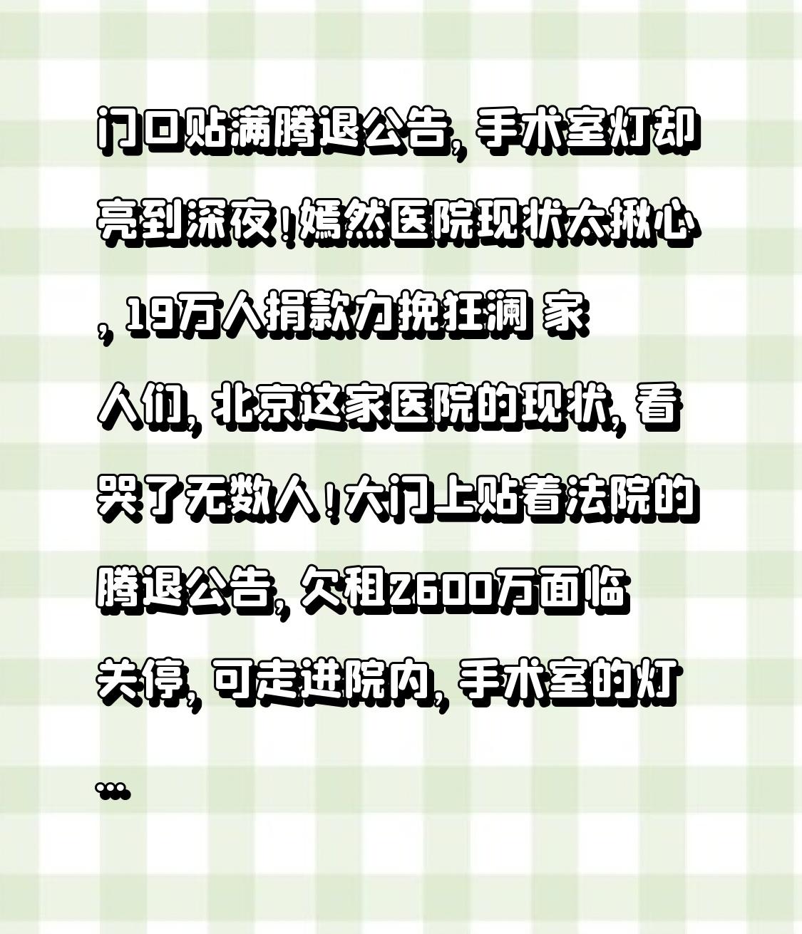 门口贴满腾退公告,手术室灯却亮到深夜!嫣然医院现状太揪心,19万人捐款力挽狂澜 家人们,北京这家医院的现状,看哭了无数人!大门上贴着法院的腾退公告,欠租2600万面临关停,可走进院内,手术室的灯还在彻夜明亮,护士站贴满患儿的感谢画,来自青海、西藏的孩子们还在等待唇腭裂修复手术——这就是李亚鹏创办的嫣然天使儿童医院,一边是迫在眉睫的搬迁危机,一边是放不下的70个患病孩子。 谁能想到,这家2012年开业的公益医院,早已成为偏远地区家庭的希望。十年来,它完成了11000台唇腭裂手术,其中7000名患儿全额免费,服务患儿超50万人次。记者实地探访发现,医院里的病床、地面还是十年前的老样子,空调老化制冷差,员工就自掏腰包买风扇;医护人员不仅治病,还得给困难家庭送餐食、全程陪护,可即便如此,他们从没想过停诊。 危机的根源要从2019年说起。当时十年租约到期,房东要求租金翻倍,从每年500万涨到1000万。李亚鹏团队犹豫了半年,想着“孩子的序列治疗不能断”,还是签下了合同,可没想到随后疫情来袭,医院几乎停摆,收入锐减。过去五年,他们已经硬撑着付了2500万租金,欠下的2600万,全是涨价的部分。 法院判决腾退,房东觉得自己是“东郭先生”,当初以半价支持公益,现在只是恢复市场价;李亚鹏坦言“情怀大过能力”,认可判决却放不下手里的手术。就在这看似无解的僵局里,转折点来了!李亚鹏一条31分钟的采访视频刷屏,他没有卖惨,只是平静讲述医院的困境和孩子们的需求,没想到直接引爆全网善意。 网友们一边倒支持:“不会做生意又怎样,他是真的在做公益”“为众人抱薪者,不能让他冻毙于风雪”。短短几天,超19万人自发捐款,金额突破1400万,有人专程跑到医院捐500元,有人在线上设置每月捐款。可让人揪心的是,这些捐款进的是嫣然天使基金,和医院是两家独立机构,没法直接用来还租金。 现在的嫣然医院,还在艰难维持运营。寒假是就医高峰,70多位患者及家属守在医院,二三十名孩子等着手术。护士长说,唇腭裂治疗要持续十余年,一旦医院关停,已经做过初期手术的孩子,后续治疗就成了泡影。一位贵州患儿母亲含泪说:“这里的免费治疗是唯一希望,要是没了,我们真的承担不起别的医院费用。” 其实大家之所以拼尽全力守护这家医院,守护的不只是李亚鹏的情怀,更是那些偏远地区孩子的未来。十年来,它用最朴素的设施,做着最温暖的公益,把无数“残缺”的童年修补完整。现在它遇到了坎,网友们的每一笔捐款,每一句支持,都是在告诉这个世界:公益不该被现实打败,善良值得被温柔以待。 目前医院还在和各方沟通,希望能找到新的出路。无论最终结果如何,那些被治愈的笑容,那些坚守的医护人员,还有亿万网友的善意,都已经成为最珍贵的财富。 你怎么看待嫣然医院的现状?你愿意为这些孩子出一份力吗?欢迎在评论区聊聊,关注我,一起追踪事件最新进展,为公益传递一份温暖!
