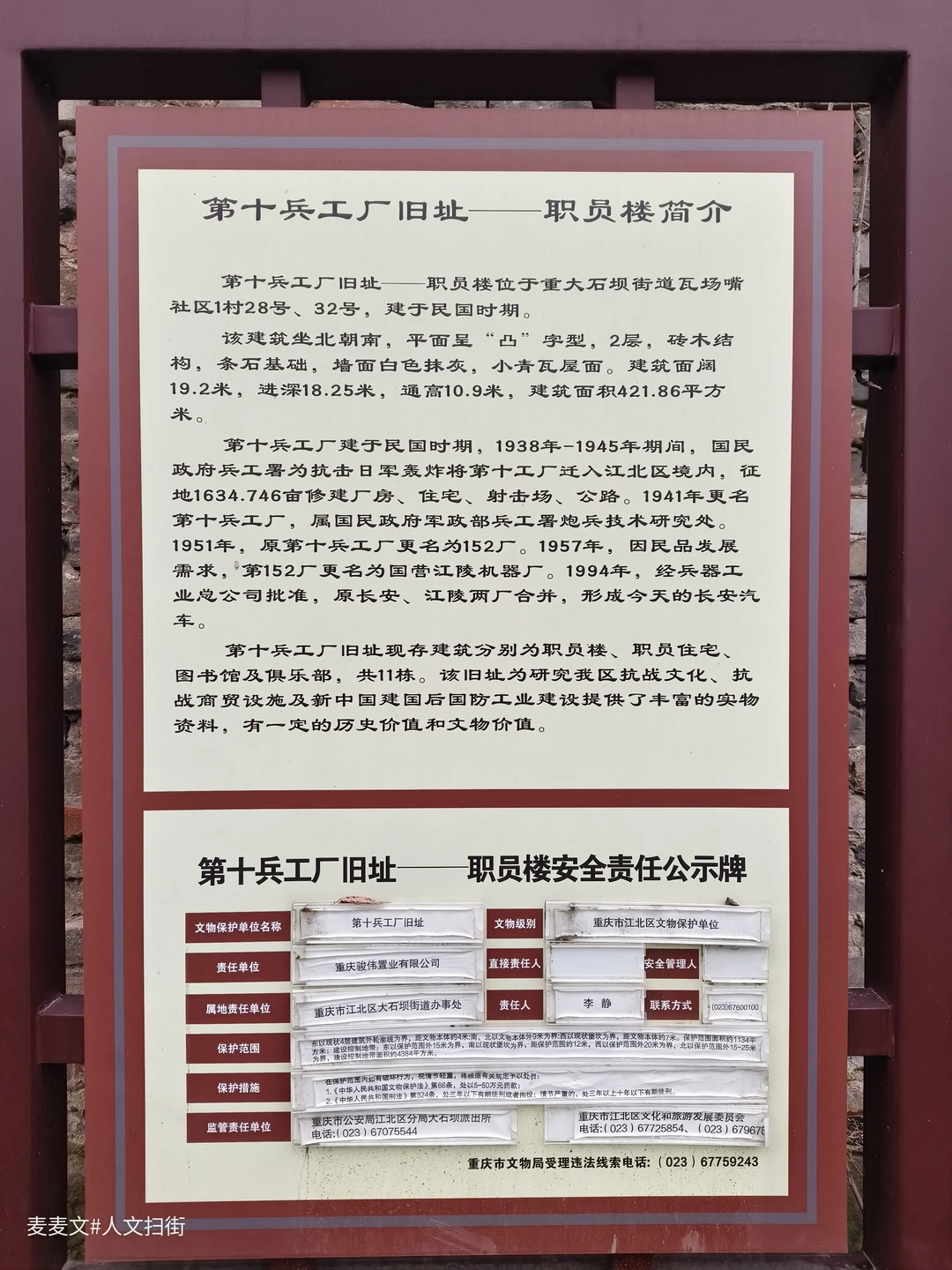 民国时期的砖木结构还立着,“凸”字型的建筑轮廓、条石基础、小青瓦屋面依稀可见当年规制。墙面的斑驳印记,藏着1938年兵工署西迁的风云,也记着第十兵工厂为抗战生产炮弹的热血岁月。后来它成了152厂、江陵机器厂的一部分,与长安汽车的渊源也刻在这砖缝里。