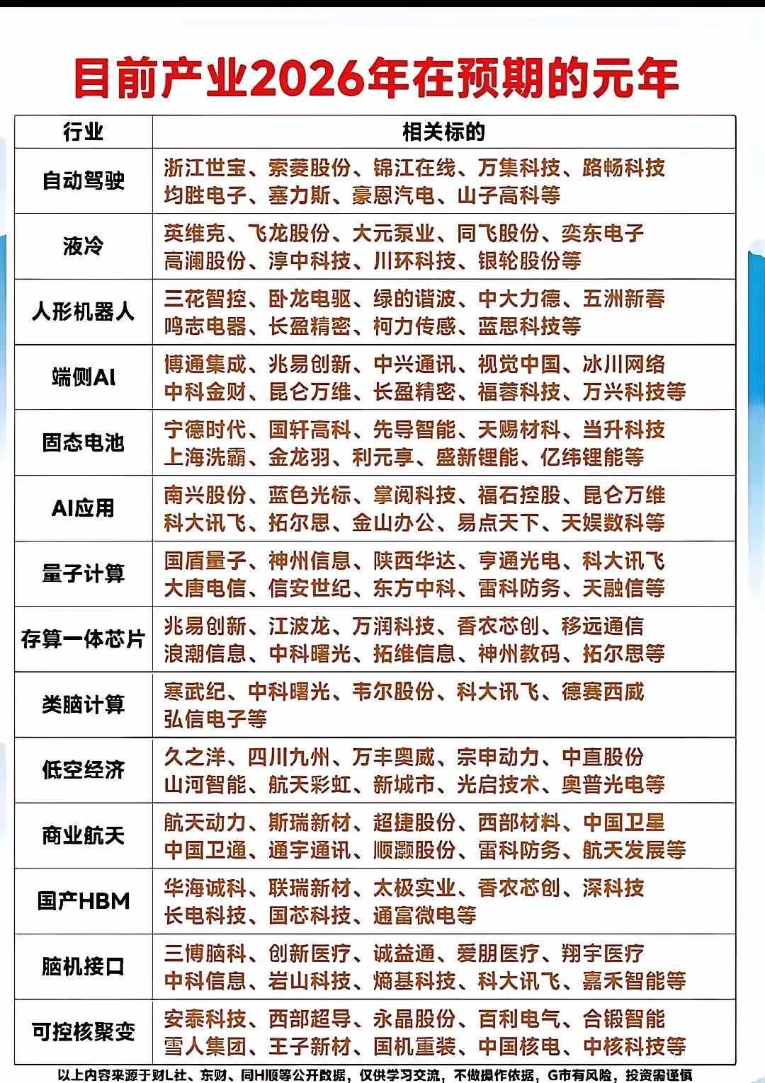 2026中国科技爆发2026成中国硬核科技爆发元年?十三大赛道卡位战藏着多少国运密码?当2026年被标定为中国新兴产业的“预期元年”,自动驾驶、人形机器人、可控核聚变等十三大赛道的企业矩阵浮出水面,这场全维度的科技布局,为何成为中国从制造大国迈向科技强国的关键一跃?这些赛道是中国突破科技封锁的核心阵地。长期以来,海外在高端芯片、精密制造、能源技术等领域形成技术壁垒,而此次列出的赛道几乎覆盖了未来科技竞争的全维度:自动驾驶打破海外车企的智能驾驶霸权,浙江世宝、万集科技的技术突破让中国车企掌握出行变革主动权;人形机器人领域,绿的谐波、三花智控的核心部件替代,终结了日本、德国在减速器、执行器的垄断;可控核聚变更是瞄准“终极能源”,安泰科技、西部超导的材料攻关,让中国在能源革命中抢占先机。每一个赛道的突破,都是对“卡脖子”技术的正面回击。从发展前景来看,这些赛道将朝着“技术融合”与“商业化落地”双轨加速。端侧AI与存算一体芯片的结合,让人工智能从云端下沉至终端;低空经济与商业航天的协同,将构建起“空天一体”的新经济生态;固态电池与自动驾驶的联动,更是推动新能源汽车产业的二次革命。2026年不仅是技术验证的关键年,更是商业化落地的爆发年,预计低空经济、人形机器人等赛道将率先实现规模化应用,撬动万亿级市场规模。更重要的是,这些赛道是中国重塑全球产业格局的底气所在。十三大赛道的企业矩阵,涵盖了材料、硬件、应用的全产业链,形成了“单点突破-集群崛起”的发展模式:国产HBM打破韩国存储垄断,脑机接口让中国在医疗科技领域实现换道超车,量子计算则为下一代信息技术埋下伏笔。这种全维度的布局,让中国不再是全球产业链的“配角”,而是成为规则制定者与技术输出方。2026年的产业预期,从来不是单纯的资本炒作,而是中国科技产业厚积薄发的必然结果。从可控核聚变的能源革命,到低空经济的空间重构,再到AI应用的场景渗透,这些赛道正勾勒出中国未来的科技版图。随着政策扶持与资本加码,十三大赛道的企业将从技术卡位走向市场领跑,而中国也将在这场科技竞赛中,真正实现从跟跑到并跑、再到领跑的跨越,让硬核科技成为民族复兴的最强引擎。