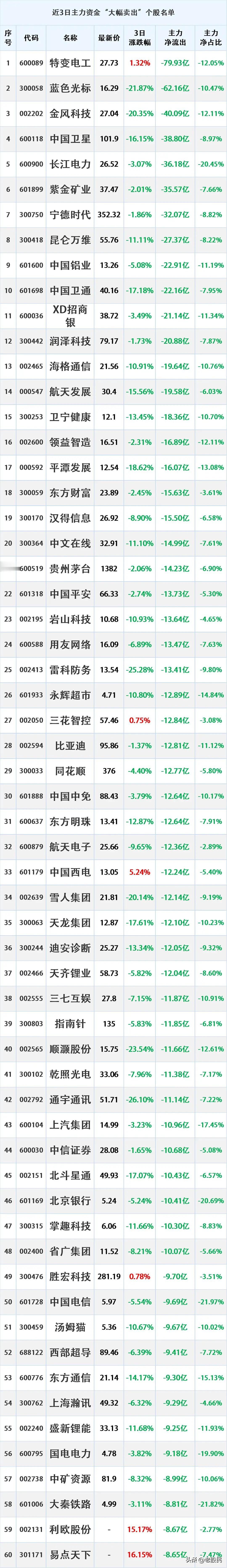 资金提前出逃,1月17日前3日主力资金最大卖出个股排名