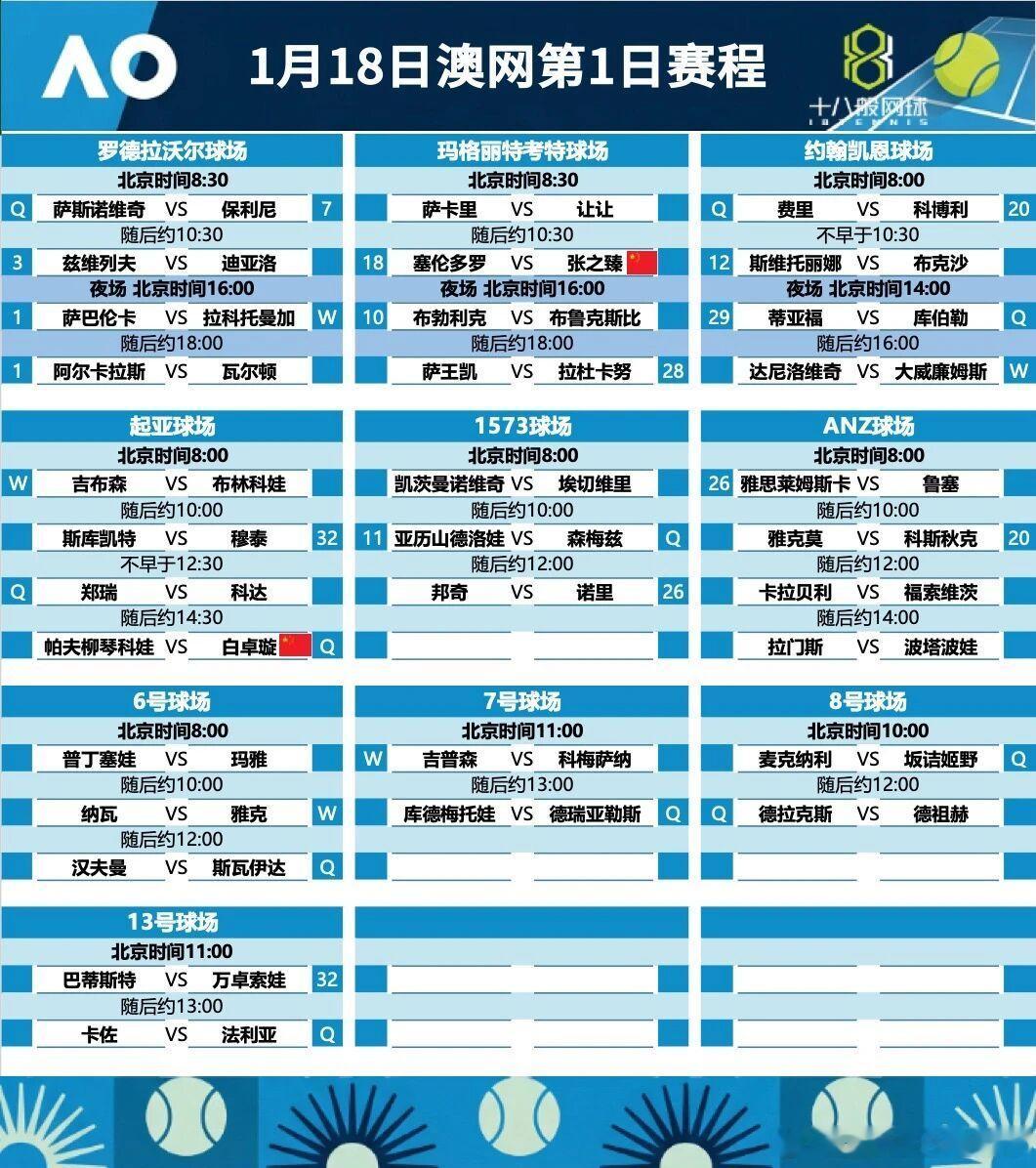 澳网第一天赛程中国球员有张之臻和白卓璇出战;而赛会的男女单头号种子阿尔卡拉斯和萨巴伦卡都要披挂上阵!明天开始直播,有空的可以捧个人场澳网2026这很澳网wta