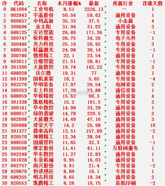 工业母机概念,一月以来涨幅最多的30名单汇总一览宇晶股份:+50.56%,最新价 59.62元,连涨 1 天中钨高新:+35.33%,最新价 37.50元,连涨 4 天金太阳:+31.94%,最新价 31.02元,连涨 3 天安达智能:+26.89%,最新价 171.36元,连涨 -1天锐科激光:+26.75%,最新价 34.26元,连涨 1 天光力科技:+25.19%,最新价 20.92元,连涨 3 天联赢激光:+24.08%,最新价 30.14元,连涨 -1天德恩精工:+22.10%,最新价 23.54元,连涨 1 天合锻智能:+21.51%,最新价 28.81元,连涨 -1天大族数控:+19.74%,最新价 142.22元,连涨 3 天