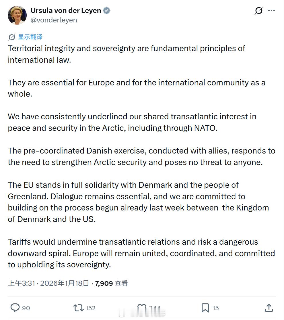 欧盟委员会主席冯德莱恩发帖,回应特朗普因格陵兰岛向欧洲8国加税 她写道:领土完整和主权是国际法的基本原则。它们对欧洲以及整个国际社会都至关重要。我们始终强调,我们在北极地区的和平与安全方面拥有共同的跨大西洋利益,包括通过北约实现的利益。这次由丹麦预先协调并与盟友共同进行的演习,是对应加强北极安全需求的举措,不对任何人构成威胁。欧盟全力支持丹麦和格陵兰人民。对话依然至关重要,我们致力于在丹麦王国与美国上周已经开启的进程基础上继续努力。关税将破坏跨大西洋关系,并可能引发危险的恶性循环。欧洲将保持团结、协调,并致力于维护其主权。海外新鲜事特朗普无论难易都要得到格陵兰岛