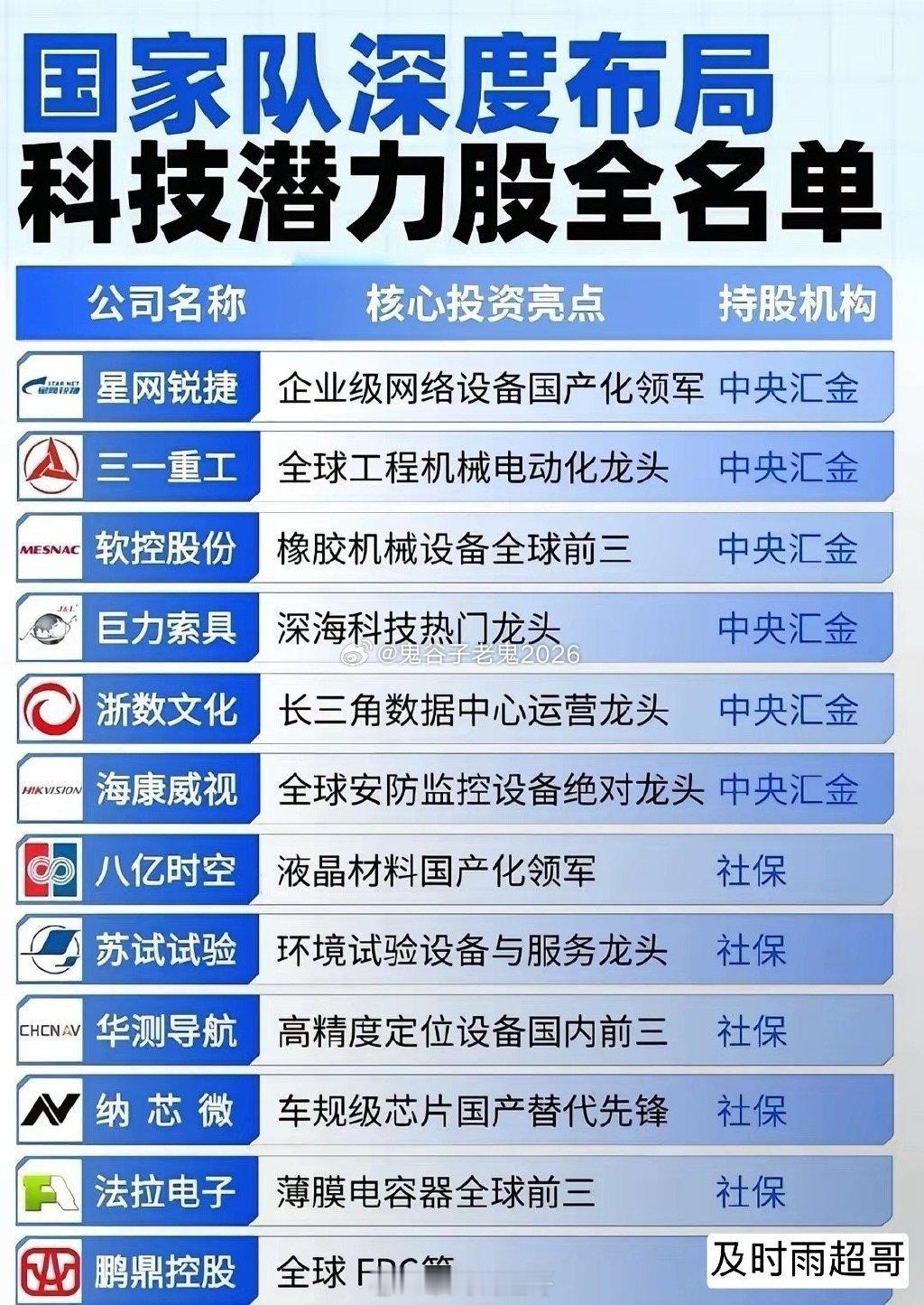 国家队概念叠加核心科技龙头!国家队重仓的科技潜力股名单来了!覆盖网络设备、芯片、智能制造、数据中心等硬核赛道,既有中央汇金加持的海康威视、三一重工,也有社保/养老保险布局的纳芯微、华大九天,更有国家大基金重仓的半导体产业链核心龙头企业等等,从国产替代龙头到全球细分领域第一,科技主线的核心标的都在这,值得重点关注。华大九天国内领先的EDA工具提供商,专注于集成电路设计、制造和封装的全流程解决方案。国家大基金持股4638万,流通市值占比8.5%,十大股东排名第四位。海康威视:全球安防监控第一龙头企业,中国电子科技集团控股上市公司,中央汇金持仓6470万股,流通市值占比0.72%……(三季度末数据)理财有风险入市需谨慎,资料仅供!