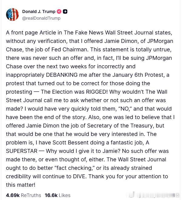 【黄金时代】川普辟谣,自己根本没有向摩根大通的杰米·戴蒙提供美联储主席一职,并透露摩根大通曾因为国会山事件取消他的银行账户川普:《华尔街日报》头版文章未经核实便声称,我曾向摩根大通的杰米·戴蒙提供美联储主席一职。这完全是无稽之谈,我从未提出过这样的邀请。事实上,在接下来的两周内,我将起诉摩根大通,因为他们在1月6日抗议活动后错误且不当地取消了我的银行账户。而那次抗议最终证明,抗议者们是对的——选举舞弊!《华尔街日报》为什么不打电话问问我是否真的提出过这样的邀请呢?我会毫不犹豫地告诉他们“没有”,然后这件事就到此为止了。此外,文章还误导读者,说我曾向杰米·戴蒙提供财政部长一职,但这确实是他非常感兴趣的职位。问题是,斯科特·贝森特做得非常出色,他是一位超级明星——我为什么要把这个职位给杰米呢?我从未提出过这样的邀请,甚至连想都没想过。 《华尔街日报》应该加强“事实核查”,否则其本已岌岌可危的信誉将继续下滑。感谢您对此事的关注!美国和欧洲当代史川普主义研究热点现场海外新鲜事