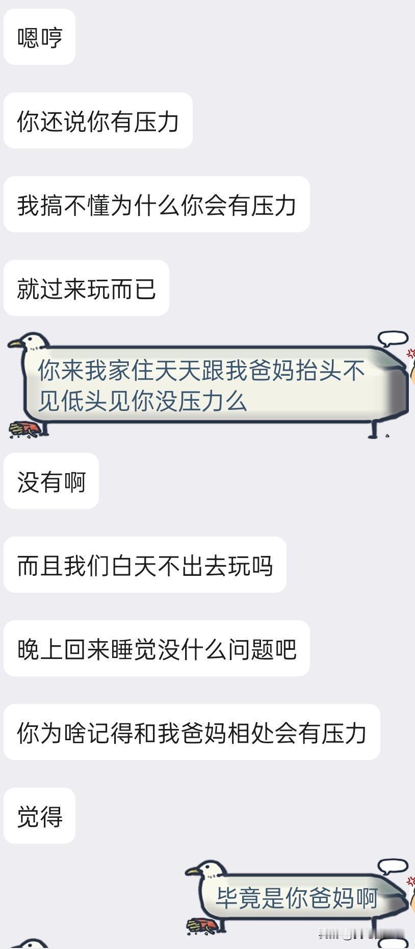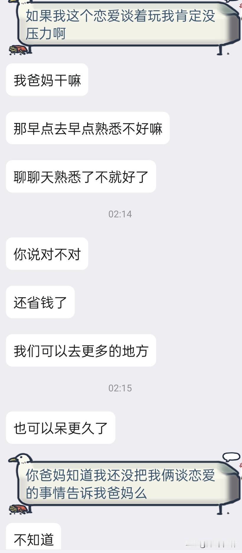 大二异地恋男朋友想让我假期见面时去他家住 煮播和男朋友同一个高中在一起谈到现在大二差不多两年半了,我俩家在一个省不同市,他去外省读大学煮播在本省读大学,寒暑假煮播去他的城市和他见面一周(因为煮播高中就在他的城市回去能刚好见见朋友,见面期间酒店车费aa)。 晚上联机玩星露谷的时候他突然提到他妈妈想让我假期去家里玩玩(之前也提过很多次了煮播都拒绝了),他说我假期可以住在他家里他爸妈也同意,这样我们就能省点钱待在一起的时间也更久能去更多好玩的地方。 煮播爸妈对恋爱这种事情其实都比较保守,我妈妈更希望我照顾好自己有了稳定的生活之后再考虑这些,其实我不打算那么早告诉爸妈我谈恋爱的事,也一直在找个合适的机会跟他们说,虽然我26年3月就要20了…我真的不知道该怎么办,我对这件事感到很无助,感觉去他们家住真的不大好,对于见家长、长辈这种事不管正不正式我都会不自在,这个假期不知道该怎么办了