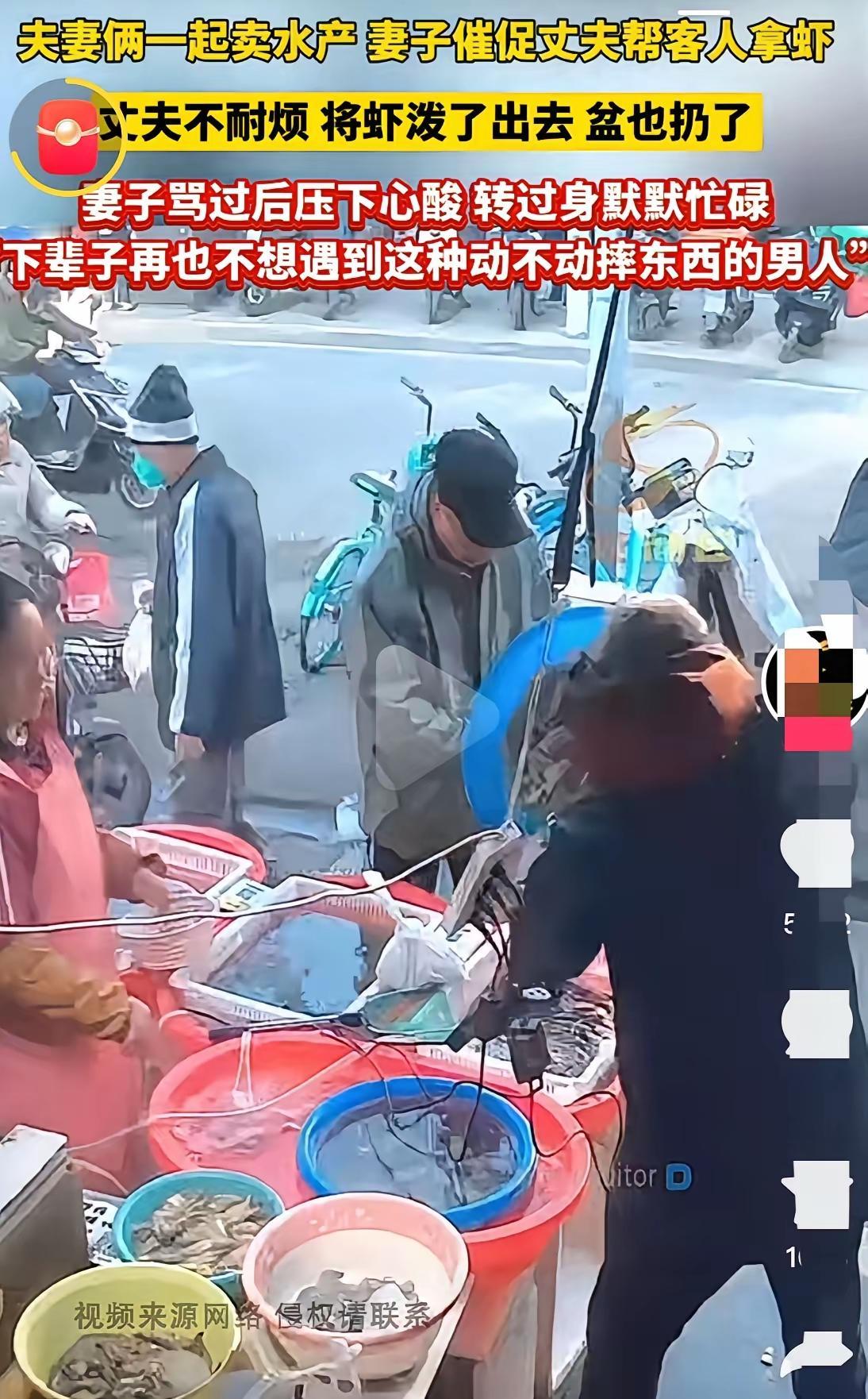 那天下午我去买菜,路过水产摊的时候正好撞见这一幕。女人在忙着给客人捞虾称重,水盆挺沉的,她瞥了眼丈夫,小声说:“你帮我拿一下盆。 男的正在拆包装袋,头都没抬,回了一句:“没看我在忙?”然后突然起身,抓起那盆连水带虾的货就泼过去。虾在地上蹦,水溅了一地,他转身就走,留下她一个人站在那儿。 没人动手拦他,大伙都愣住了。女人也没喊没叫,就说了句“算了”,然后弯腰开始捡地上的虾和塑料盆 动作很慢,但一直没停。过几分钟,她又像没事人一样继续卖虾,脸上甚至还带着笑。有人劝她别理那种男人,她摇摇头,没接话。 视频后来在网上传疯了。很多人都说这男的太过分,但我觉得事没这么简单。他们家这摊子生意开了好几年,我经常来买,平时看着也正常。 听说俩人一起干活,她管钱管账,他干体力。可他好像不太乐意被她指挥,尤其是有外人在的时候,总显得烦躁。 以前就听旁边卖鱼的大姐提过,这男的脾气不怎么好,秤摔过两次,还有次把整条鱼扔地上,就因为老婆说他算错账。 她说:“两口子做生意最容易吵架,天天在一块,烦都能烦死。”可闹到这个地步,还是第一次。 关键是她为什么不走?不是没路可走,是走了孩子怎么办,摊子怎么办,这月房租还没交。她亲戚也说:“她不是没想过离,可真到了那一步,又下不去手。 两个人熬了这么多年,早就不是感情不感情的事了,是活法绑在一起了。 这其实不光是家暴的问题。很多人一看就说“报警啊”,可真报警了,生意还做不?街坊知道了,客人会不会少?她在外面再能撑,回家还得面对同一个屋檐下的人。这种事,冷处理反而成了最现实的选择。 那天之后我又去过一次,她还在摊上。他没出现,来了个亲戚帮忙搬货。我问虾今天还活吗,她点点头,捞了一兜给我,动作干净利落。我没多问什么,付完钱就走了。路上想着,那一盆泼出去的不只是虾,还有多少说不出口的日子。 她照常营业,照常称重,照常笑着和人说话。就像什么事都没发生过。
