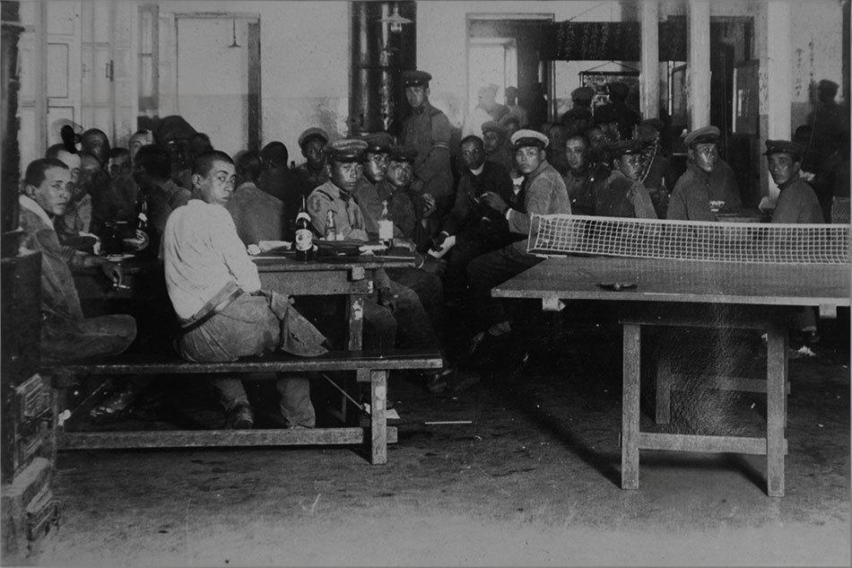 1927年,关东军在东北一处室内营房。粗糙的水泥地面、裸露的木质立柱与斑驳的墙面,透着临时营房的杂乱。右侧的木质乒乓球桌网布松弛下垂,桌面磨损得失去光泽,是士鬼子们为数不多的休闲设施。 这里挤着数十名身着军装关东军,有的靠在墙上抽烟,有的围在桌边把玩酒瓶;还有穿便服的随军雇员或当地人员,侧身坐在长凳上与士兵交谈。 关东军的前身是1905年日俄战争后设立的“南满铁道守备队”,以“保护铁路”为幌子实质推行殖民控制。1919年,日本在旅顺正式组建关东军司令部,将守备队升级为战略进攻力量,1927年时兵力约8000人,已从“铁路保安”转向军事扩张。 到1931年“九一八事变”时,关东军仅以1.04万人(1个师团+6个铁道守备大队)就迅速占领东北,正是得益于1927年起的长期渗透与军事准备。这张照片里的士兵,正是后来发动事变的核心力量。
