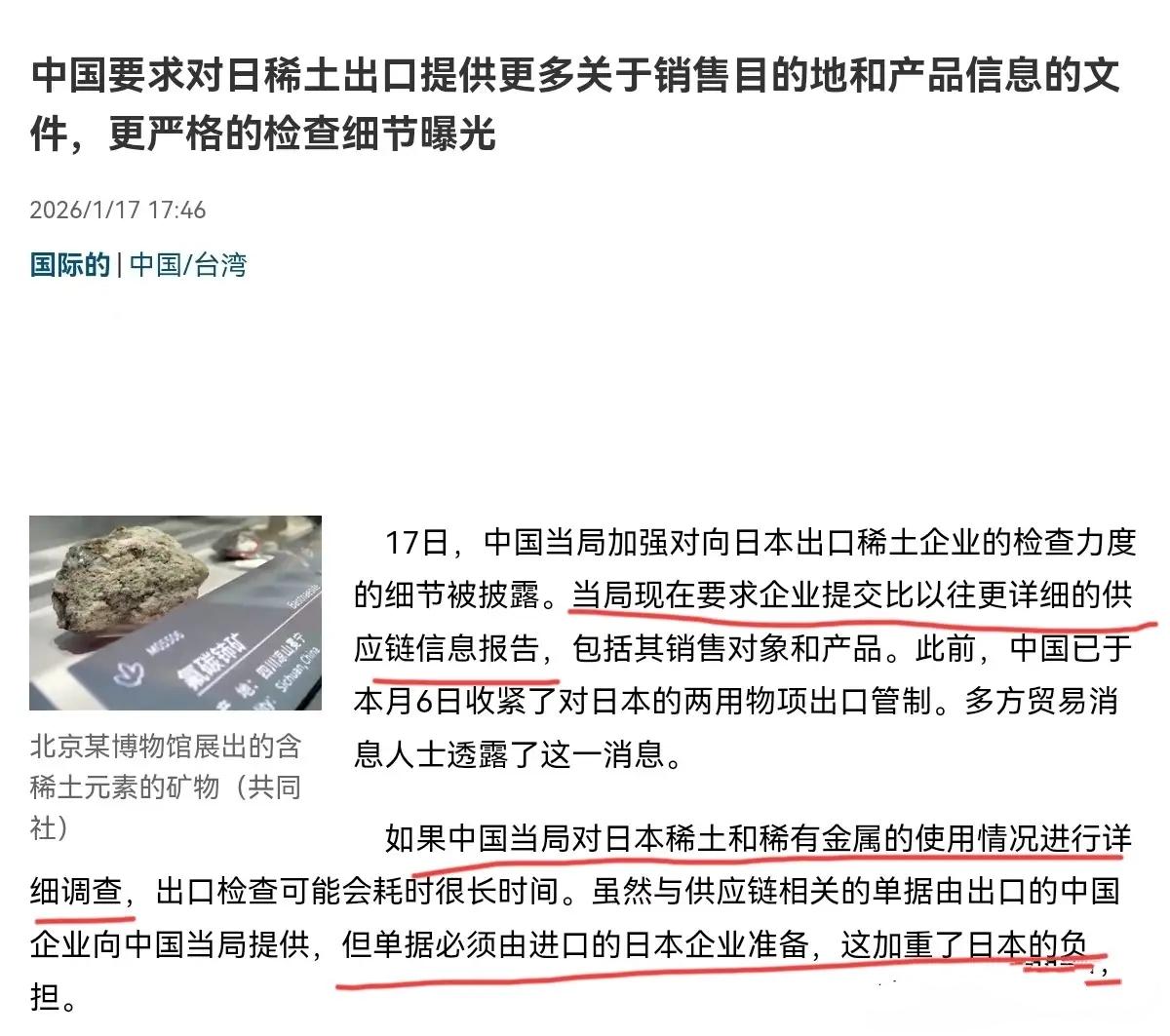日本这才回过味,中国的管制力度远超他们想象! 原本觉得只是走个流程,结果细 则一公布,日本企业全傻了眼。 1月17日,日媒 披露中方加强对日稀土出口企业检查的细节,要求企业提交比以往更详细的供应链报告,得说清稀土最终用在啥产品、中间商是谁、日本生产的东西会不会出口美国,更关键的是,这些单据得日本企业准备,中国 当局还要核查准确性,这下企业负担直往上窜,原本顺畅的 流程全卡壳了。 日本企业开始叫苦,说手续变复杂、成 本涨了不少,但这根本是他们自己作的,妄图突破和平宪法、扩军费搞进攻性武器,军工扩张的野心早藏不住了,中方这么严,就是要确保 两用物资不流进日本军工企业,半点侥幸都不给 留。 日本早就想摆脱稀土依 赖,搞了个深海开采计划,2026年1月15日,国立海洋研究开发机构启动南鸟岛附近海域的稀土开采测试,声称那有大量重稀土,可专家都摇头,技 术 复杂成本高,15年前东海撞船后没搞成,现在也没成熟,这根本就是画饼充饥,短期内别想替代中国供应。 中国1月6日就宣布对日实施两用物项管制,清单里有900多 种物项,涵盖材料、软件、技术,远超外界以为的只限稀土,可日本媒体报道不足,企业反应 滞后,直到一周后NHK访谈里专家说“中国真的开始管稀土了”,他们才意 识到问题严重,连半导体用的稀有金属都被管了,民用领 域也受影响,这管控的全面性压根 不是闹着玩的。 中方的管控更狠,搞“物项+技术”双 轨制,含中国稀土成分超0.1%的境外产品,都得追溯来源,这直接堵死绕道进口的路,而且不是全面禁运,是盯着日本军工的关键环节,比如穿 甲弹芯、航空发动机需要的材料,表面民用实则嵌进军工的企业,全被精准打击,正常民用贸易还留着,既维护安全,又避免贸易战,这战略定力够稳的。 中方的 措施根本不是拍脑袋,是冲着日本“再军事化”来的,精准打在军工体系的七寸 上,让那些想钻空子的企业没活路,而日本呢,资源依赖中国这么多 年,深海开采又搞不定,现在只能被动应对,想扩军工,先过供应链这关再说。 未来日本的麻烦更大,一方面要解决稀土依赖,另一方面得应付企业的抱怨,可 技术不成熟、环保争议在那摆着,短期内别想翻身,中方这步棋,把 日本的资源战略彻底逼到被动。 “天天喊着稀土重要,现在自己的供应链资料都搞不定了,早干嘛去嘞!”这话扎心但实在,日本早该想到,依赖中国资源又搞军工,哪有这么美的事? 中方的精准管控,把日本的野心困 在了供应链里,日本企业叫苦,可这都是自作自受,想搞进攻性武器、突破和平宪法,就得付出代价,可问题来了,日本真能收敛吗,还是会变着法绕开管制? 要 我说,这管制管得太对了!日本想搞军工就得付出代价,别以为中国会看着他们乱搞,咱们是对自 己 安全负责,也是对世界和平负责,那些叫苦的企业,早干嘛去了,之前帮着军工藏得挺深,现在被查出来,能怪谁? 这事你怎么看?