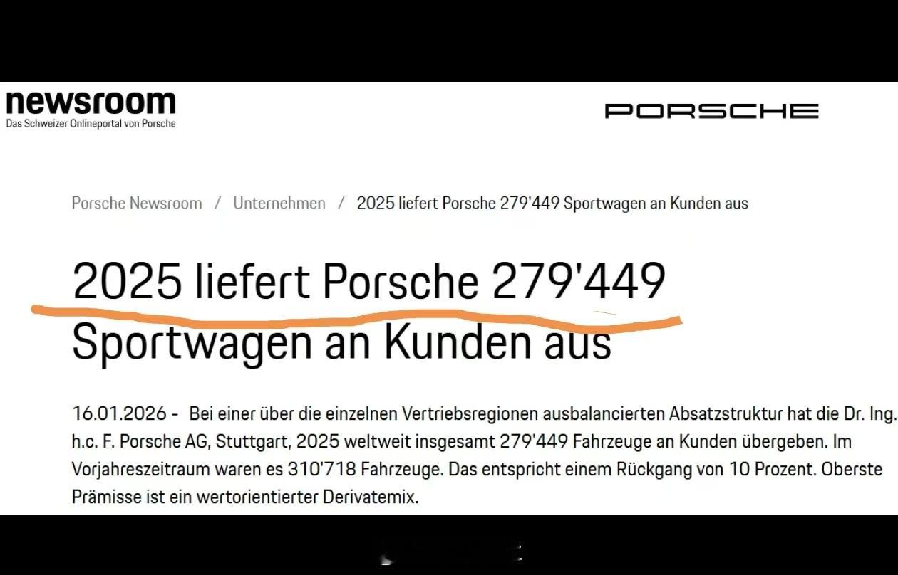 保时捷公布2025年全球交付数据,全年交付279449,相较于2024年的310718辆下降10%其中,中国区交付量同比暴跌26%,从2024年的56887辆锐减至41938辆