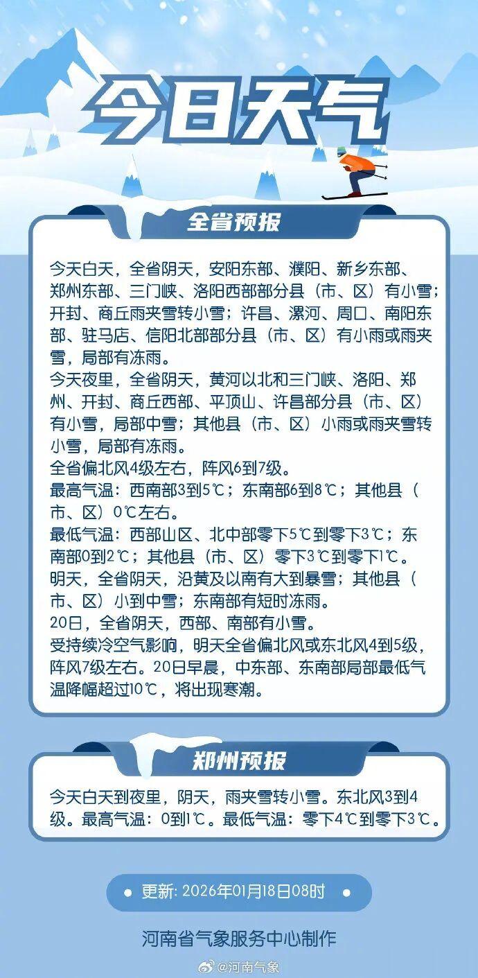1月18日,记者从河南省气象台了解到,今天白天,全省阴天,安阳东部、濮阳、新乡东部、郑州东部、三门峡、洛阳西部部分县(市、区)有小雪;开封、商丘雨夹雪转小雪;许昌、漯河、周口、南阳东部、驻马店、信阳北部部分县(市、区)有小雨或雨夹雪,局部有冻雨。今天夜里,全省阴天,黄河以北和三门峡、洛阳、郑州、开封、商丘西部、平顶山、许昌部分县(市、区)有小雪,局部中雪;其他县(市、区)小雨或雨夹雪转小雪,局部有冻雨。全省偏北风4级左右,阵风6到7级。最高气温:西南部3到5℃;东南部6到8℃;其他县(市、区)0℃左右。最低气温:西部山区、北中部零下5℃到零下3℃;东南部0到2℃;其他县(市、区)零下3℃到零下1℃。