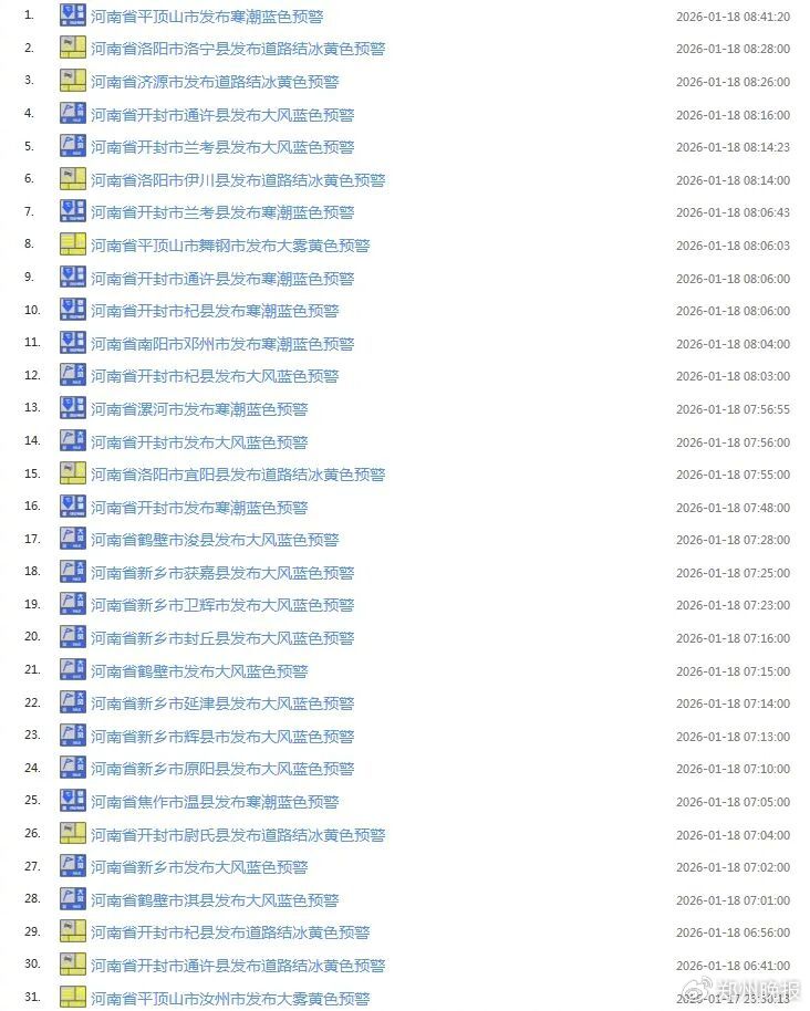 据预报显示,河南多地发布寒潮、大雾、大风及道路结冰等预警,截至1月18日8:45,共有88条预警生效中!