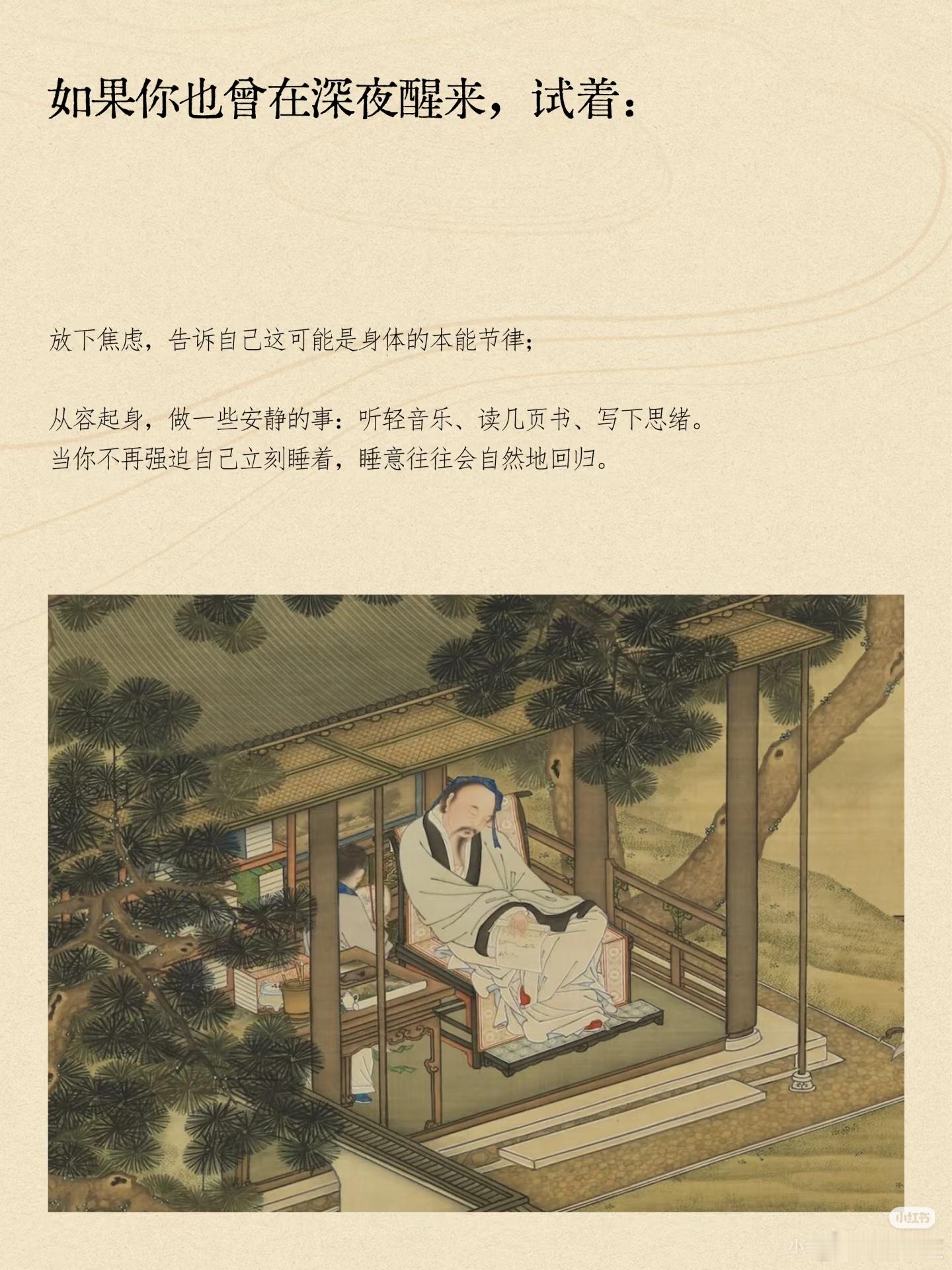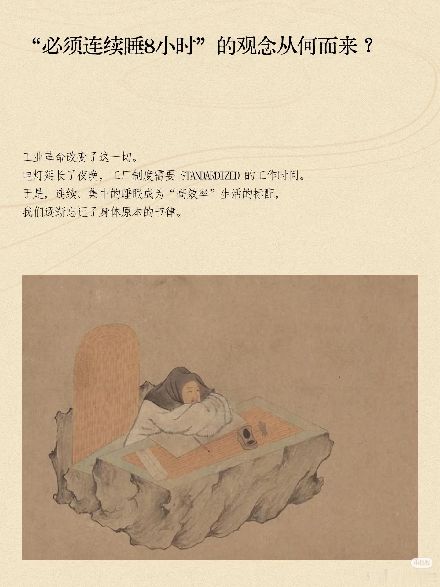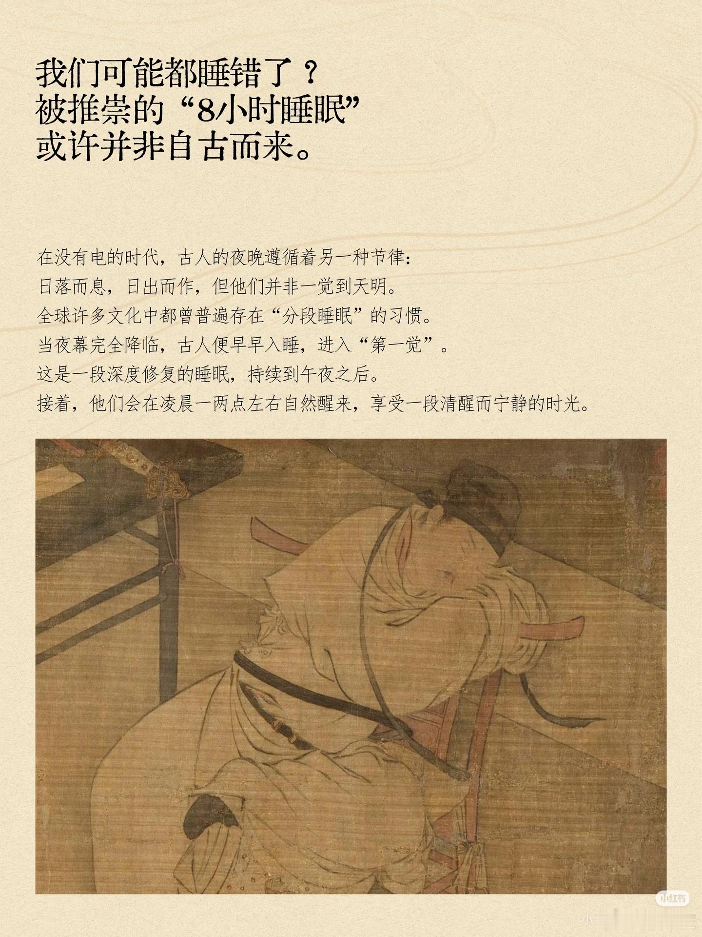 睡眠冷知识】我们可能都睡错了1. 古人怎么睡?分段制。第一觉(深睡修复)→ 半夜自然醒 → 安静活动1-2小时 → 第二觉(到天亮)。2. 为什么?无电时代,身体遵循“日落而息”与内在睡眠周期(约90分钟),夜半清醒是正常节律,而非失眠。3. “8小时睡眠”从哪来?工业革命。电灯延长了夜晚,工厂制度需要标准化作息,于是“连续睡眠8小时”成了社会新规。4. 给我们的启示深夜醒来别紧张。这可能是身体的古老记忆。像古人一样,从容地读会儿书、听点音乐,反而更容易重新入睡。