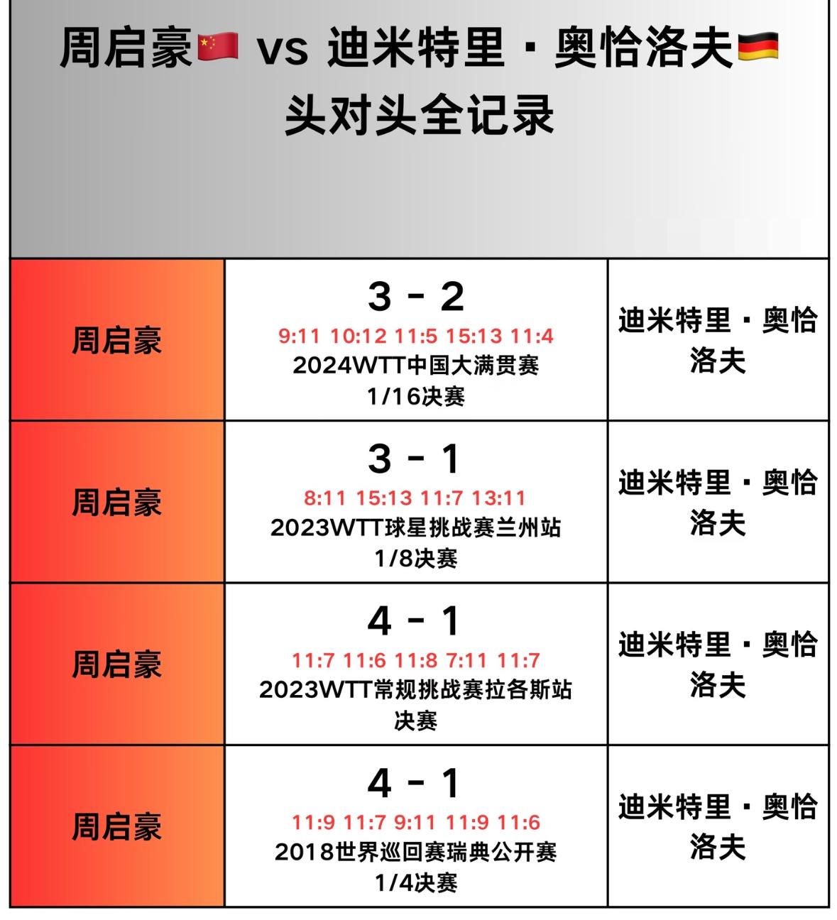 周启豪与奥恰洛夫的头对头记录——多哈球星挑战赛男单半决赛周启豪VS奥恰洛夫 2026多哈球星挑战赛, 男单半决赛, 1月18日16:40, 周启豪VS奥恰洛夫, 从以往的交手记录来看, 周启豪对奥恰保持4战全胜的 优势战绩, 最近一次交手是在2024年 的北京大满贯赛事上, 当时周启豪以3:2战胜奥恰洛夫, 也是在连输两局后, 连扳三局, 周启豪这一次一定注意奥恰的发球, 也是一年多没打了, 接发球环节处理好就没问题👍, 周启豪继续满电, 加油,夺冠的希望就靠你了!
