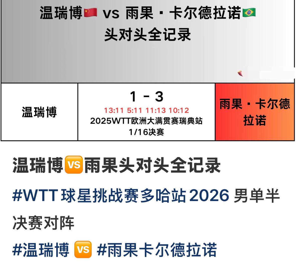 温瑞博与雨果的头对头记录—多哈球星挑战赛男单半决赛对阵温瑞博VS雨果 从以往的交手记录来看, 小将温瑞博虽然在去年的瑞典大满贯输给雨果, 但比赛非常胶着, 温瑞博拼的非常热血, 打出了自己的气势和态度, 符合王皓指导的训话, 输也要站着输! 1月18日下午六点, 男单半决赛, 温瑞博VS雨果, 只要能打乱雨果的进攻节奏就行, 在关键分的处理上, 更果断更细腻一些, 上次打到最后一局就是 10:5领先被掀翻的, 希望小将温瑞博能吸取教训, 总结经验,保持良好的心态和状态, 继续加油!
