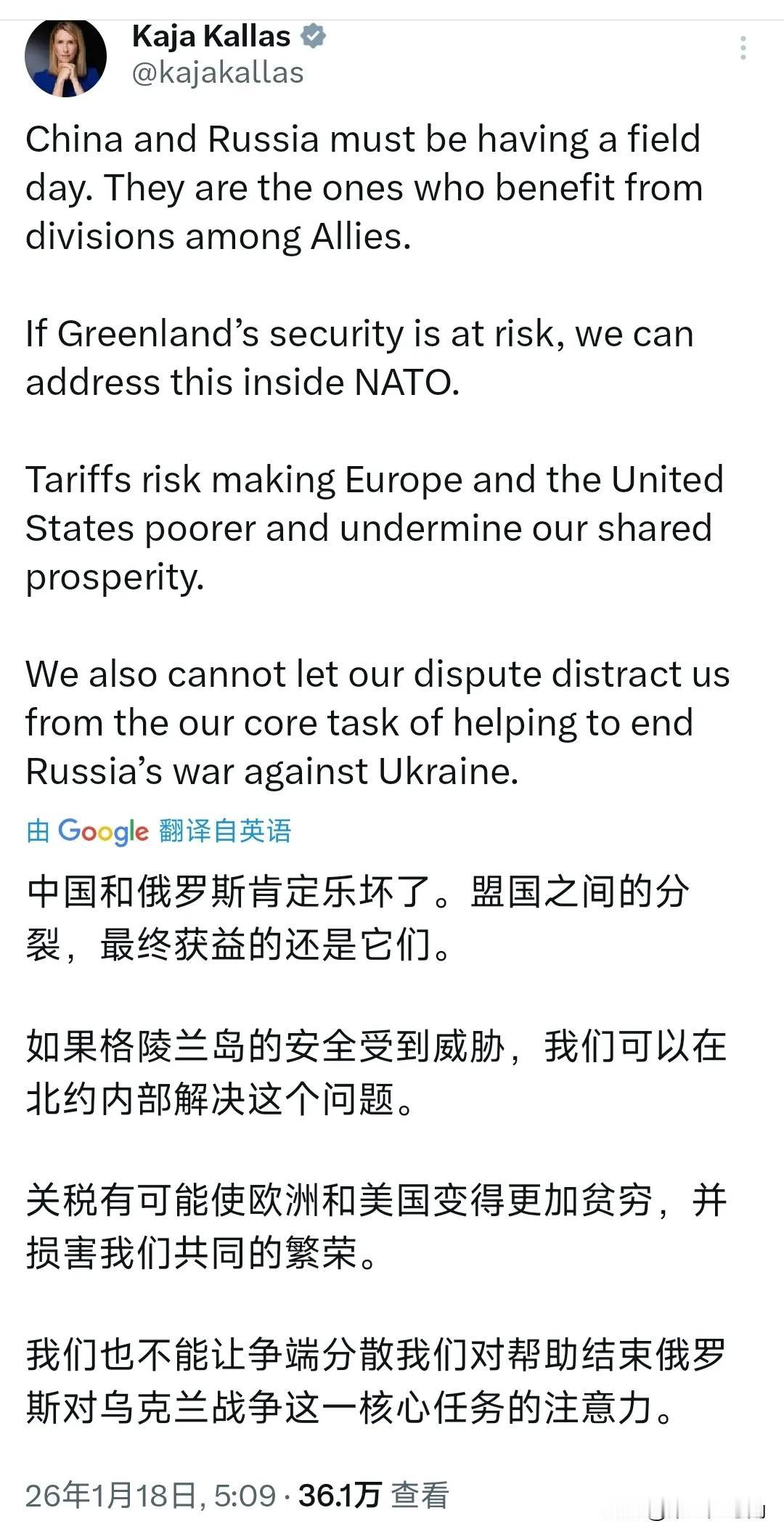 欧盟外交与安全政策高级代表卡拉斯今天(北京时间1月18日)发文写道:“中国和俄罗斯肯定乐坏了。盟国之间的分裂,最终获益的还是它们。如果格陵兰岛的安全受到威胁,我们可以在北约内部解决这个问题。关税有可能使欧洲和美国变得更加贫穷,并损害我们共同的繁荣。我们也不能让争端分散我们对帮助结束俄罗斯对乌克兰战争这一核心任务的注意力。” 评几句 卡拉斯这番“中俄乐坏了”的论调,本质上是把欧美内部裂痕的责任外包给“假想敌”。格陵兰问题首先是丹麦的主权事务,却被美方以“安全”之名摆上交易桌;欧盟不先去约束盟友的扩张冲动,反而把“分裂”归咎于中俄“捡便宜”,是典型的战略懒惰。更讽刺的是,她一边警告“关税让欧美更穷”,一边又支持对华加税、对俄制裁,自己抡起贸易大棒,却怪别人“渔翁得利”。把乌克兰危机设为“核心任务”固然政治正确,但若继续用意识形态划线、用关税当武器,只会加速全球南方对欧美双重标准的厌倦。中俄没偷没抢,欧盟先把自己的篱笆扎紧,再谈“共同繁荣”才有说服力。