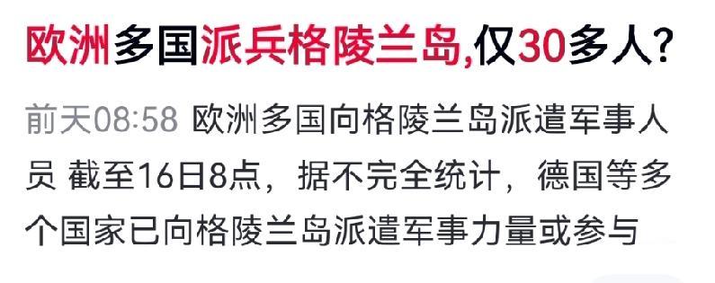 你看懂欧洲派兵30人格陵兰岛,被称为“刀尖上跳舞”吗? 欧洲破天荒向格陵兰岛派兵30余人,别看人少,这步子迈得可谓惊天动地。在欧洲防务长期依赖美国的背景下,组建联合部队直面美国,堪称“刀尖上跳舞”。 虽然欧盟27国中响应者寥寥,但敢来的都是真“勇者”。这背后不仅是力挺丹麦,更是欧洲不甘一味顺从的明确信号。对美国说“不”,哪怕只是小小一步,也意味着局势正在起变化。 别再笑欧洲动作小——这份“勇敢”背后,藏着风向转变的大文章。 对此你怎么看?