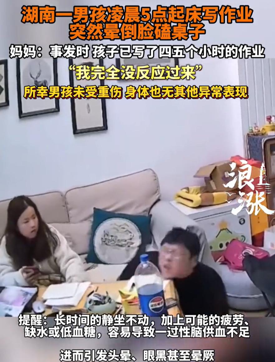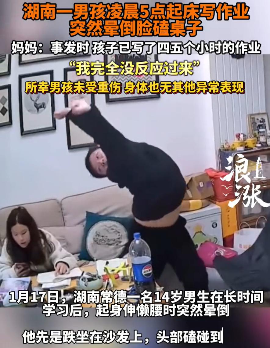 湖南常德,一名14岁初中生凌晨点起床写作业,没想到,写了几个小时,起身抻了个懒腰,结果再坐下时突然就失去意识晕倒了,脸还磕在桌子上,孩子妈妈也是一阵后怕,称当时自己完全没反应过来 家中监控显示,当时孩子从沙发站起来抻懒腰,他先是把双臂举起,然后反方向抻腰,大概坚持了三四秒,突然就坐到沙发上,任谁看了都以为他是累了,可接下来他却不受控制,直接脸砸到桌面上,整个人倒在了地上,家人这才反应过来发生了啥 孩子母亲表示,事发前,孩子从凌晨五六点就开始写作业,久坐了四五个小时。看到孩子突然晕倒,自己一时也没反应过来。幸运的是,孩子身体无其他异常表现,晕倒时也没受伤 很多人第一反应是心疼,孩子作业压力太大,都要凌晨起床赶工。但讨论慢慢转向另一个方向:为什么只是伸个懒腰,人就突然晕了? 有网友提到一个词:体位性低血压。简单说,就是长时间坐着或蹲着,血液容易集中在下半身,突然站起来时,血液来不及回到大脑,造成短暂缺血,就会头晕甚至昏倒。而这个孩子的情况可能更复杂一些,他不仅是久坐后突然起身,还加了一个向后仰的伸懒腰动作,颈部过度伸展,可能影响到了椎动脉的血流,大脑供血短时间内跟不上,晕厥就发生了 这种现象其实并不少见。很多人都有过蹲久了猛地站起来眼前一黑的经历,只是像这样直接晕倒的属于比较极端的情况 我觉得这个事对家长也是一个提醒,关心孩子的成长,不止是关心作业写完了没有,分数考了多少,也要留心他们是不是坐得太久,有没有时间站起来走一走、动一动