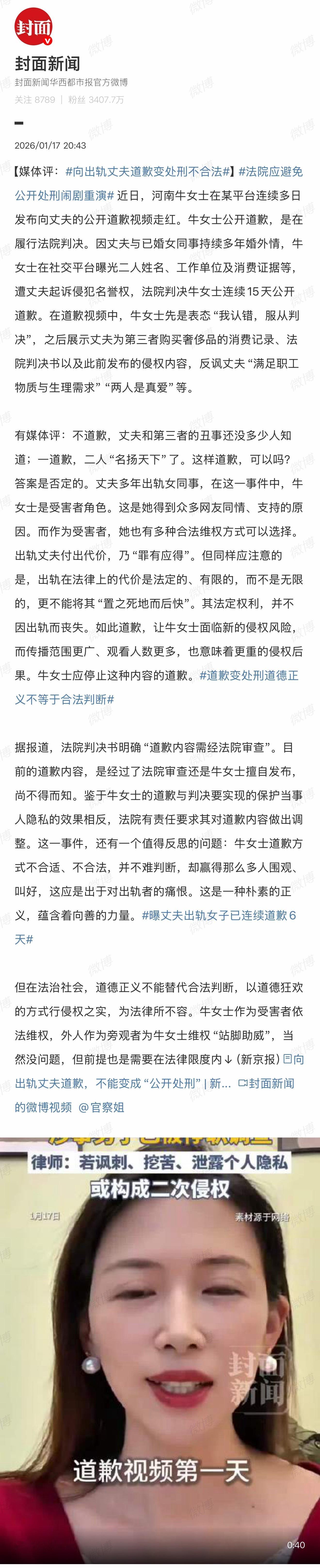 法院应避免公开处刑闹剧重演合法不合法不是媒体和律师判定的,这要法院来判定。合情合理与否是舆论来判断,也就是群众的声音。本博奉劝某些媒体和律师不要没事找事,管好自己的事就行。如果出轨男觉得自己被伤害了,那就继续走法律程序呗。老张杂谈