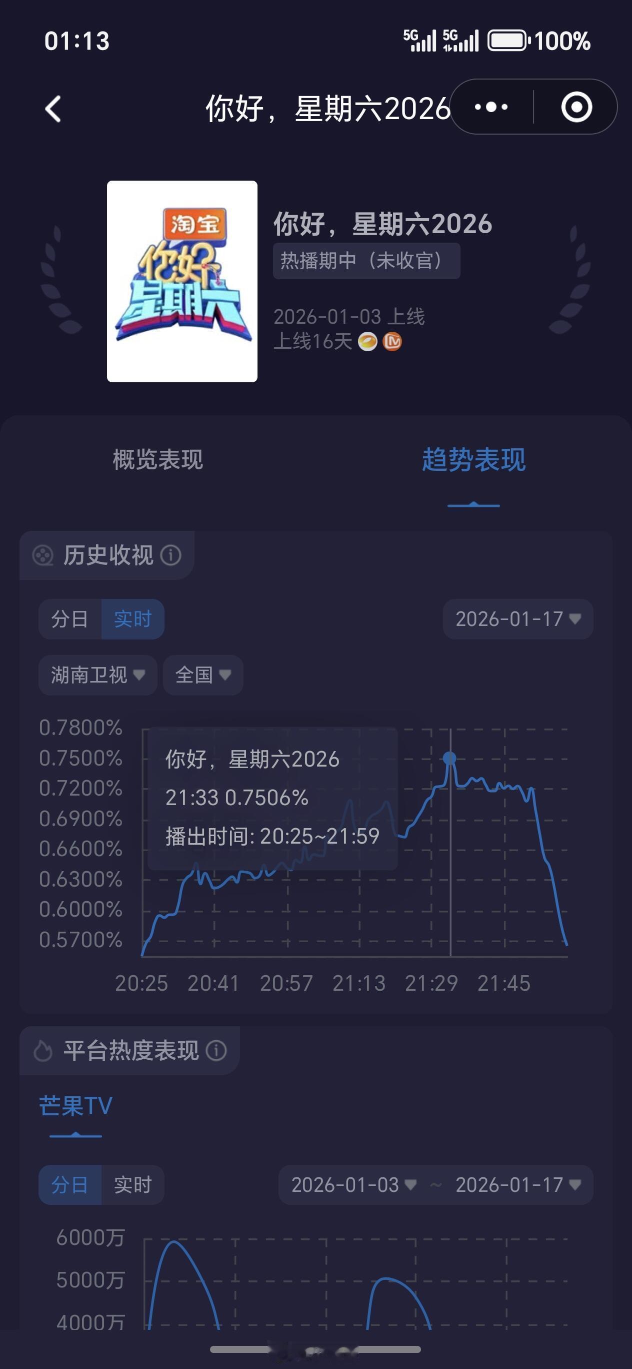 本周《你好星期六》收视率大涨19.7%本周《你好,星期六》实时收视率又创近期新高,平均收视0.6655,收视率峰值冲破0.7586,大涨19.7%,排名省级卫视第一!本期嘉宾:刘昊然,董子健,苏醒,陆虎,李嘉琦,李雪琴,丁程鑫,杨迪,何炅,吴泽林你为谁而看?!!你好星期六‖