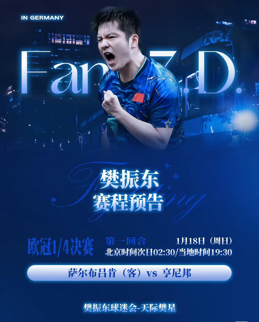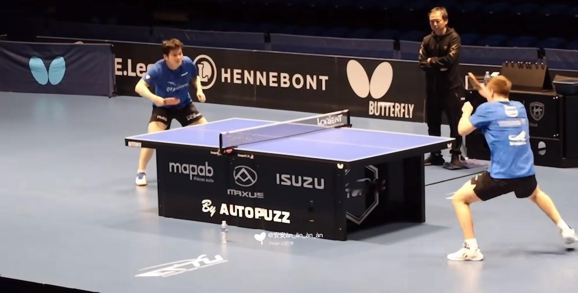 1月18日樊振东与莫雷加德一起训练备战欧冠—近日凌晨2:30欧冠1/4决赛 樊振东与莫雷加德已经到达 法国布列塔尼备战欧冠! 樊振东与莫雷加德已经训练上啦, 这个球台又换了, 每个俱乐部的赞助商不同, 所以到哪里比赛, 就用谁赞助的球台! 莫雷加德去年带领萨尔布吕肯拿下 欧洲杯冠军🏆, 这阵容,太强啦, 已经定好闹钟, 今晚凌晨2:30准时起来看樊振东…… 欧冠1/4决赛, 樊振东加油!